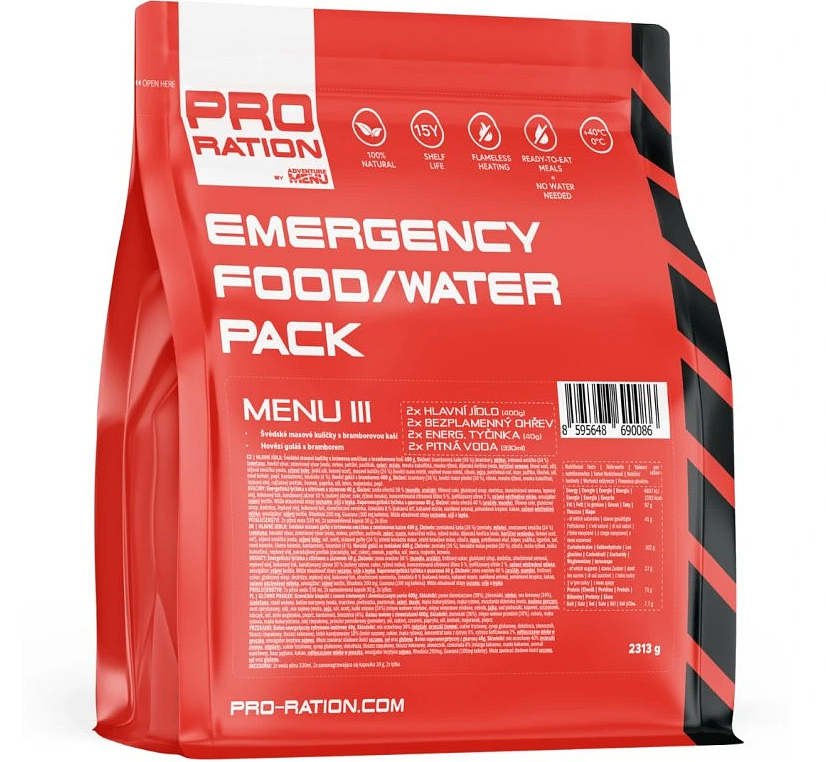 2× Pitná voda (330 ml): Ve speciálním balení s trvanlivostí 50 let.