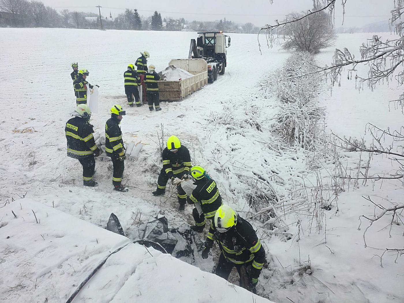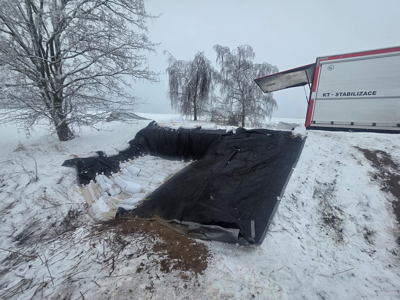 Na místě docházelo k masivnímu úniku převáženého materiálu do půdy a do blízkého potoka. Z tohoto důvodu nasadili hasiči několik sorpčních hadů, použili velké množství sorbentu a dalších sorpčních prostředků. Přizvali rovněž k součinnosti pracovníka životního prostředí a vodoprávního úřadu.