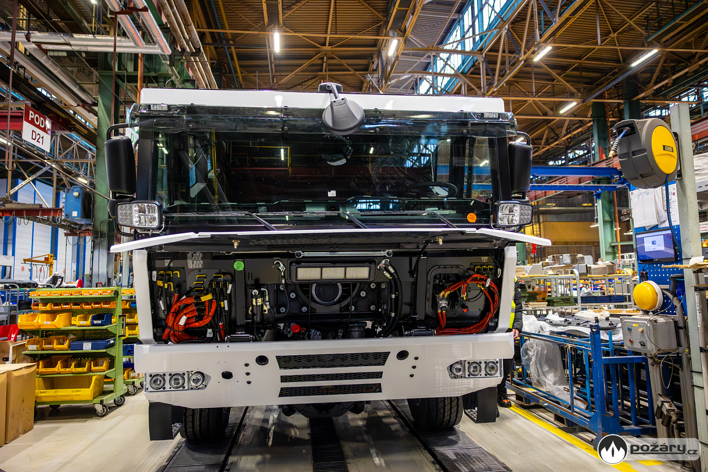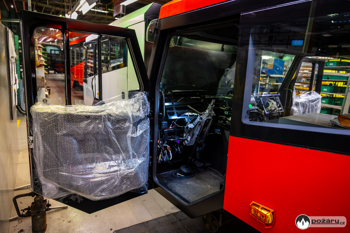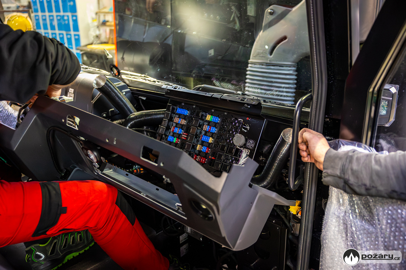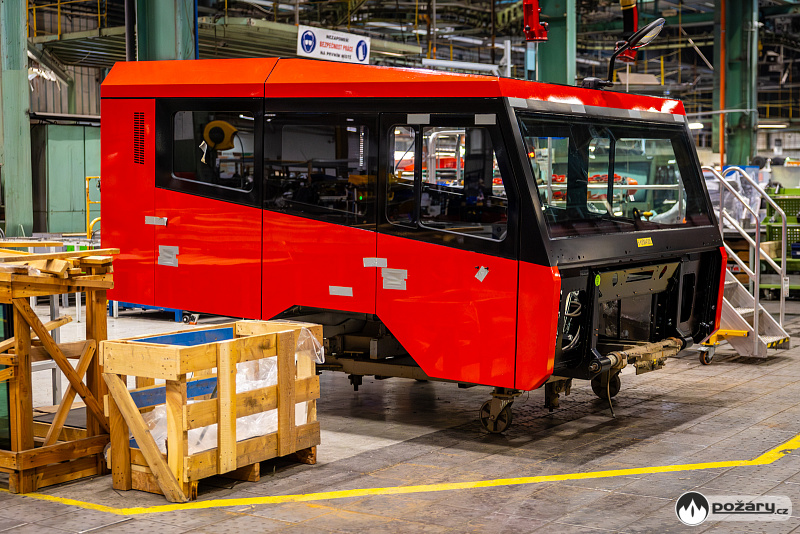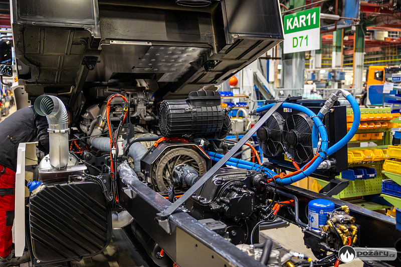 Jakmile je hnací ústrojí na svém místě, přichází na řadu montáž kabiny a následné oživení celého vozu. V kabině se už v Kopřivnici připravuje „hasičská“ elektroinstalace – pro světelné výstražné zařízení, pro osvětlení zadní řady sedadel a další.
