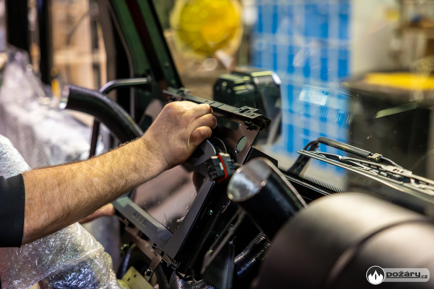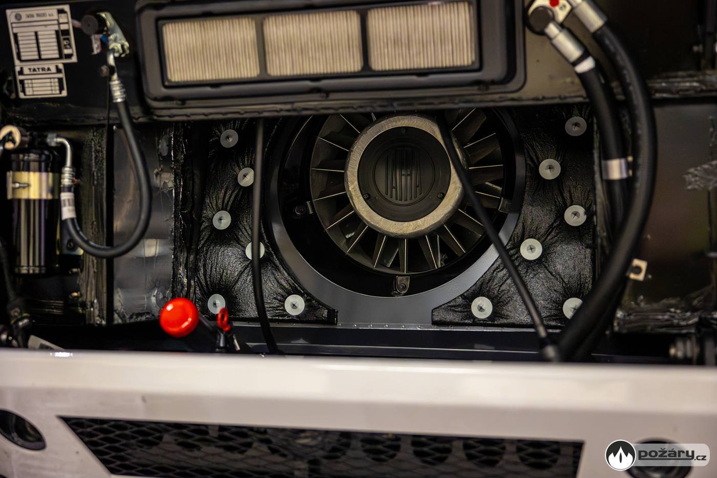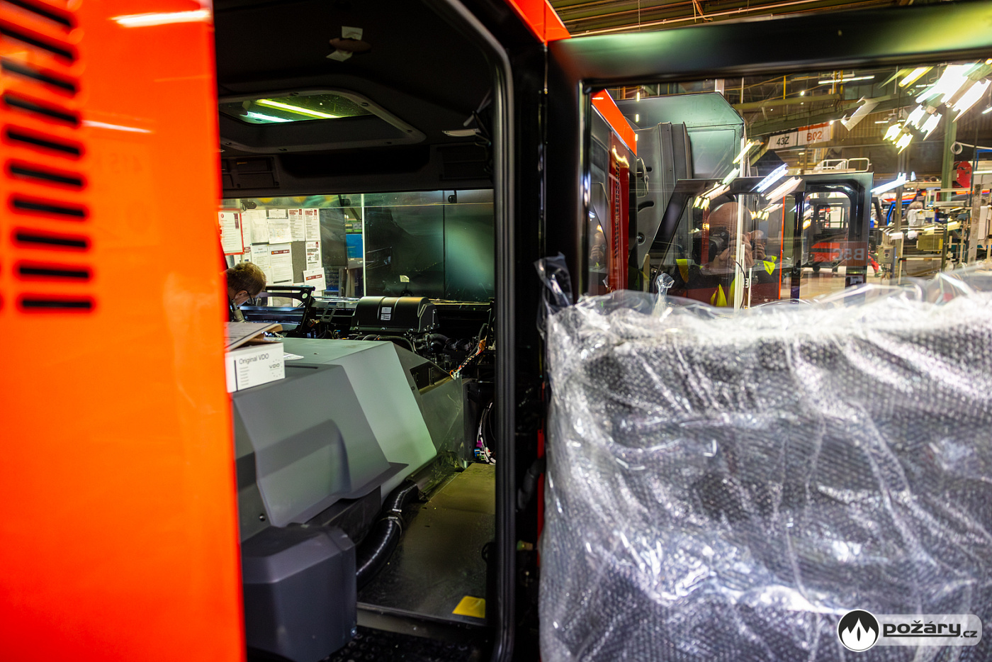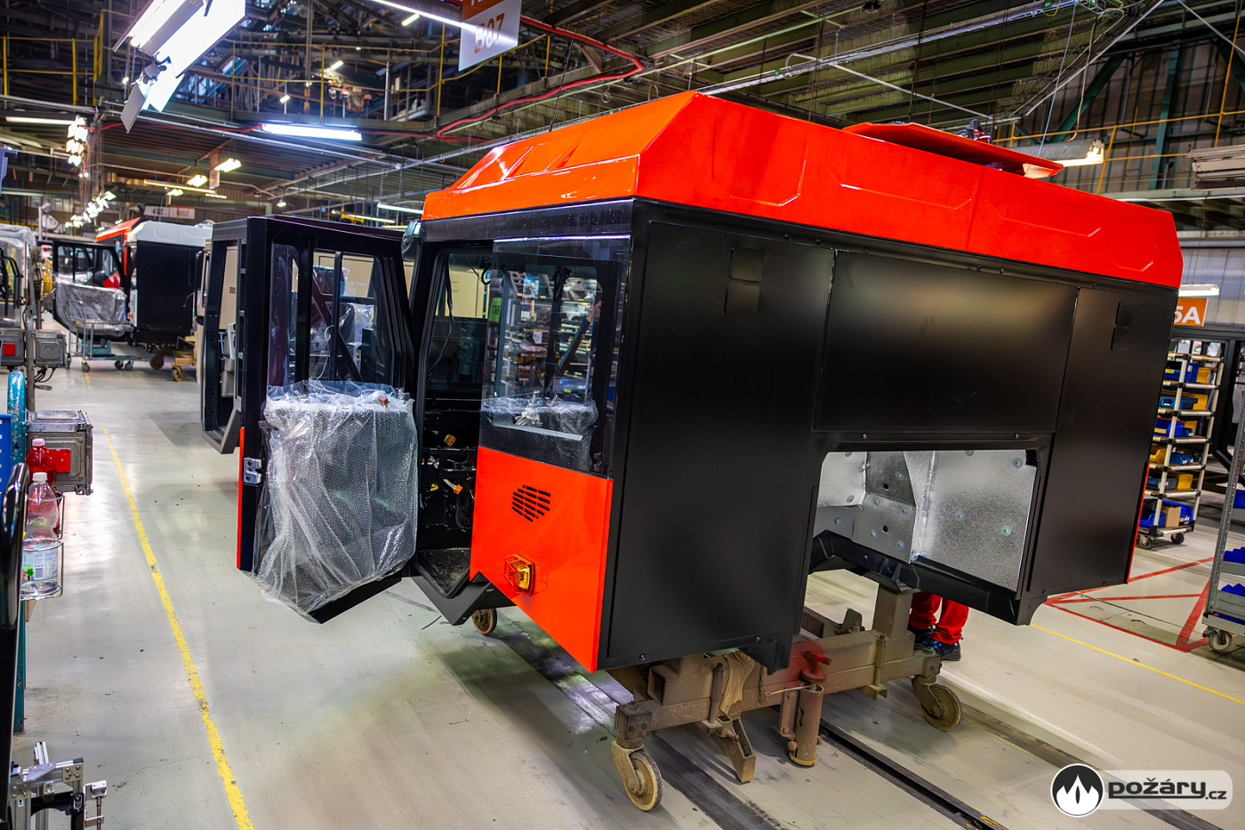 Jakmile je hnací ústrojí na svém místě, přichází na řadu montáž kabiny a následné oživení celého vozu. V kabině se už v Kopřivnici připravuje „hasičská“ elektroinstalace – pro světelné výstražné zařízení, pro osvětlení zadní řady sedadel a další.