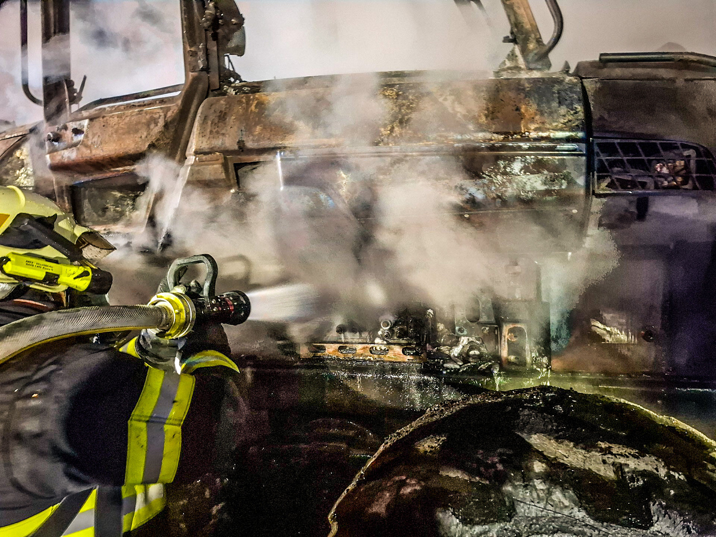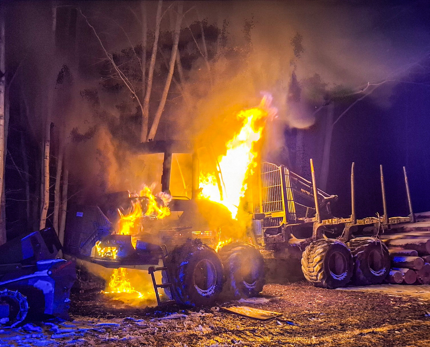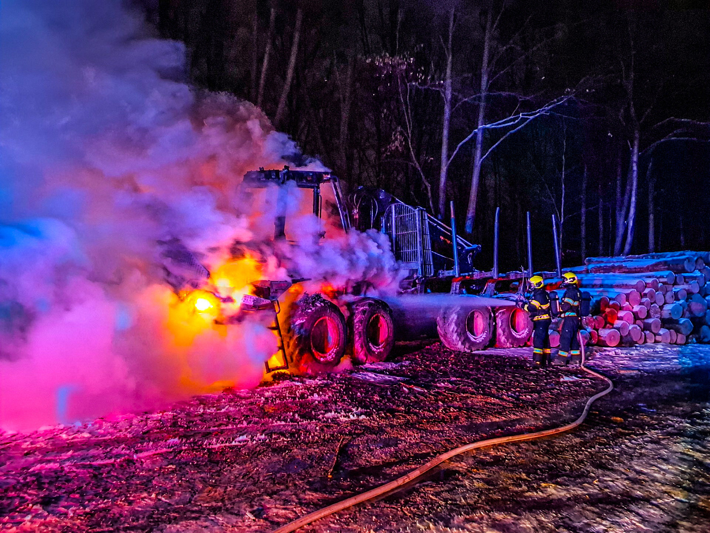 Po příjezdu na místo hasiči zjistili, že požárem je zasažen kompletně celý stroj. Na likvidaci požáru nasadili hasiči v dýchací technice dva C proudy. Požár se podařilo lokalizovat po pár minutách a díky tomu se zabránilo rozšíření na okolní lesní porost.