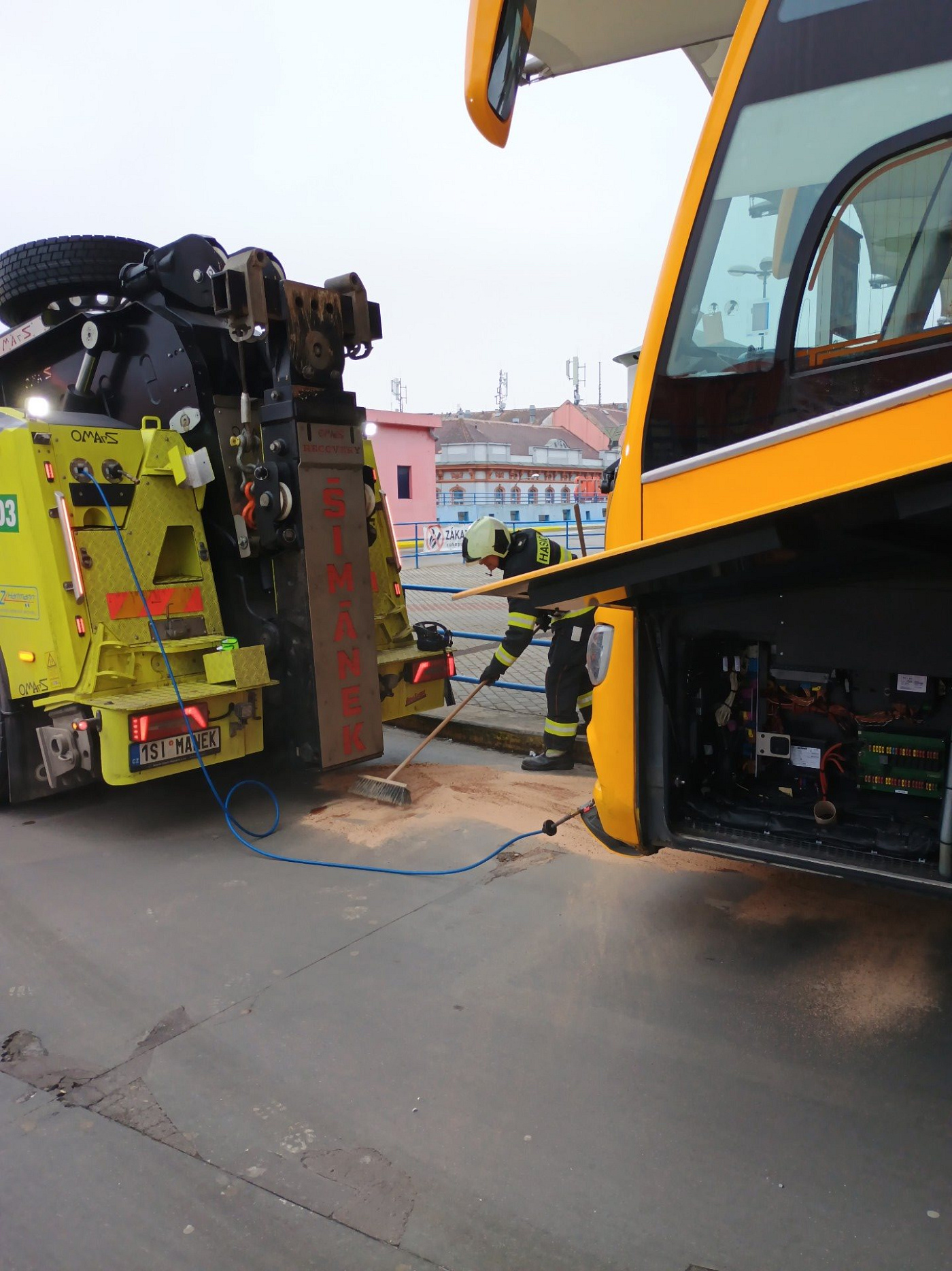 Na autobusovém nádraží na střeše OC Mercury v Českých Budějovicích zasahovali hasiči u autobusu, kterému prasklo řízení. Vytekl z něj motorový olej. Olejové skvrny hasiči zasypali sorbentem a uklidili. Nepojízdný autobus byl odtažen.