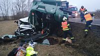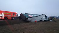 Nehodu kamionu, pod kterým se při úhybném manévru utrhla krajnice a on se převrátil do příkopu, likvidovali od půl páté na silnici I/20 u obce Sedlec profi hasiči z Vodňan a Č. Budějovic. Do kamionu navíc narazila dodávka. ZZS ošetřila jednu osobu, vyproštění nebylo nutné.