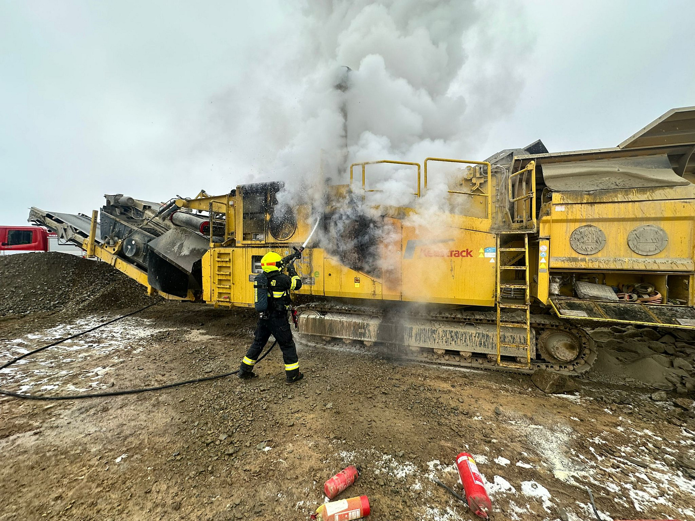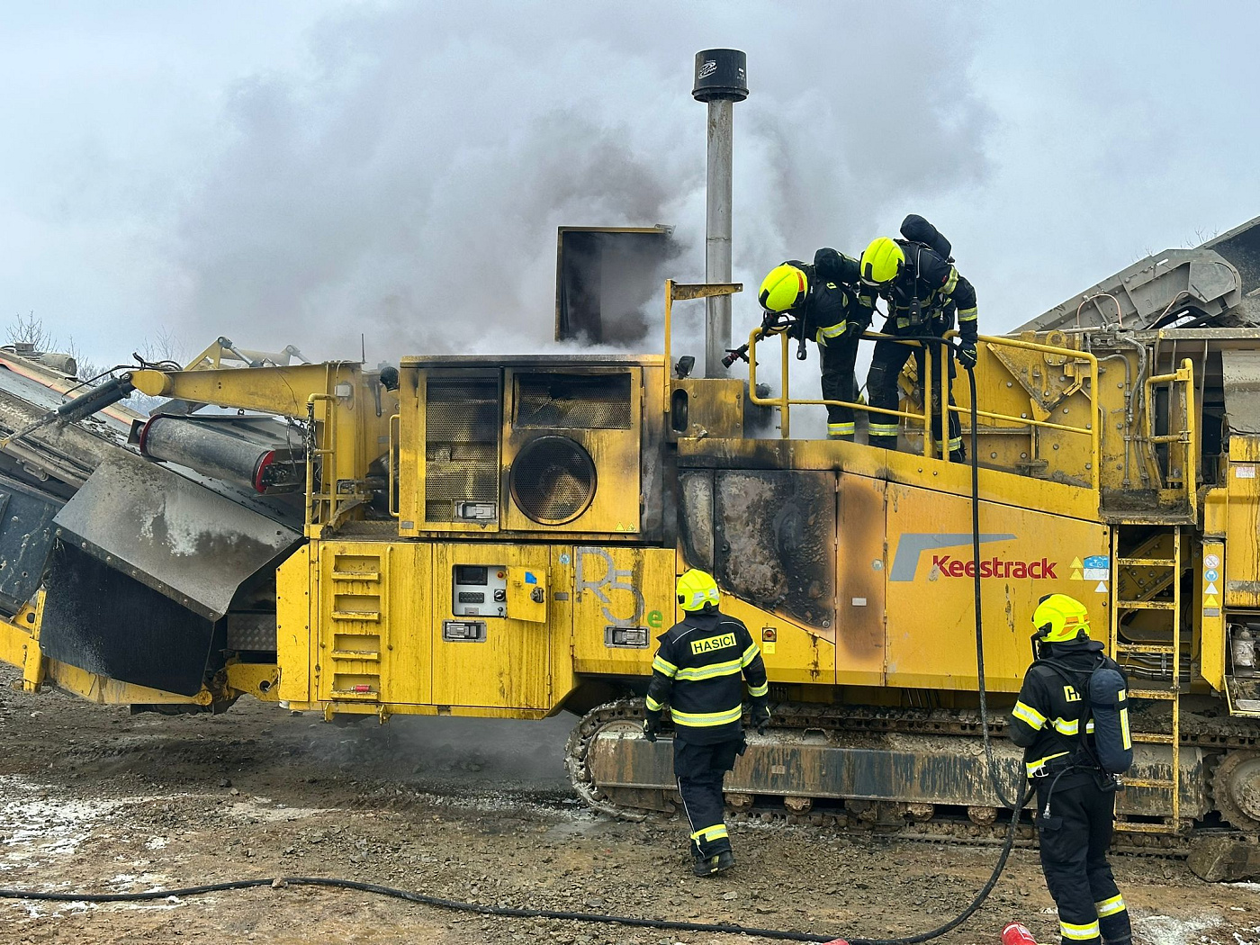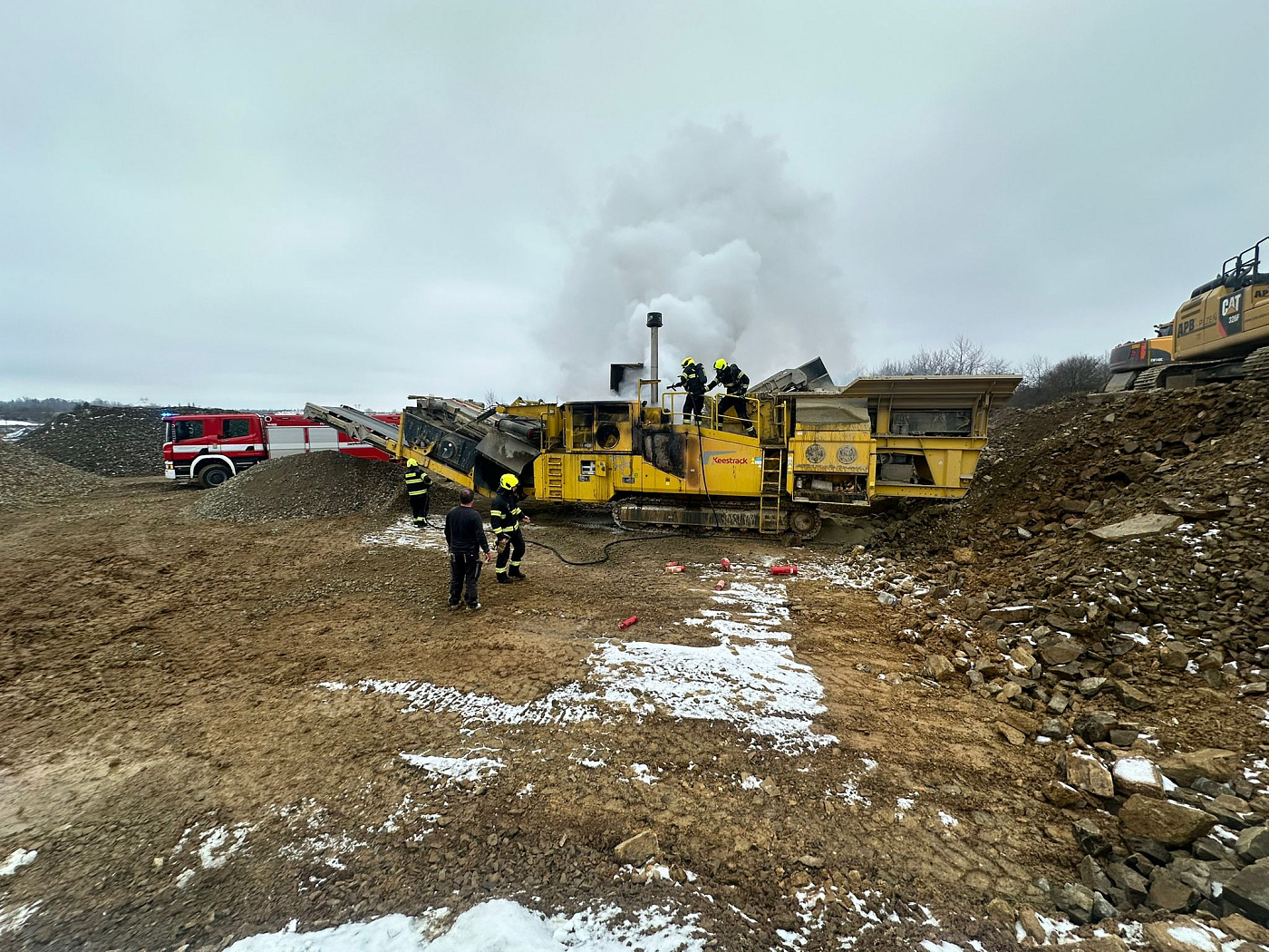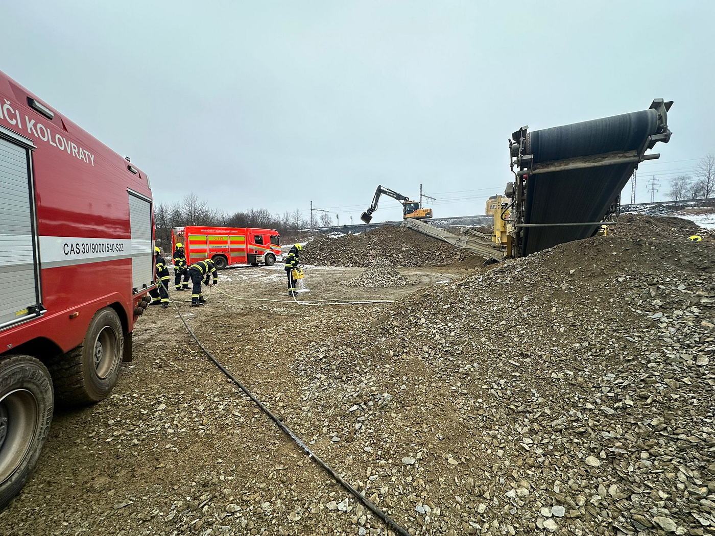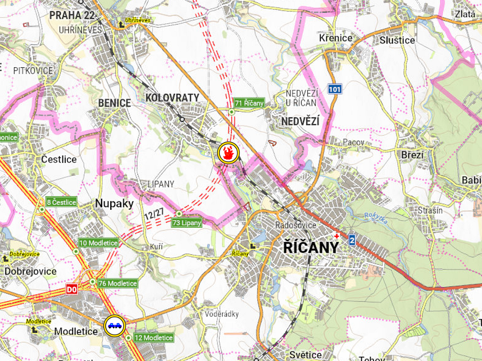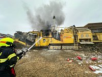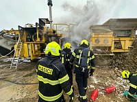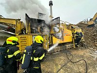 K požáru velkého zemního stroje (drtič kamene) na stavbě Pražského okruhu vyjeli v rámci mezikrajské spolupráce necelou hodinu po poledni na pomoc pražským kolegům z hasičské stanice Chodov a dobrovolným z Kolovrat profesionální hasiči z Říčan.