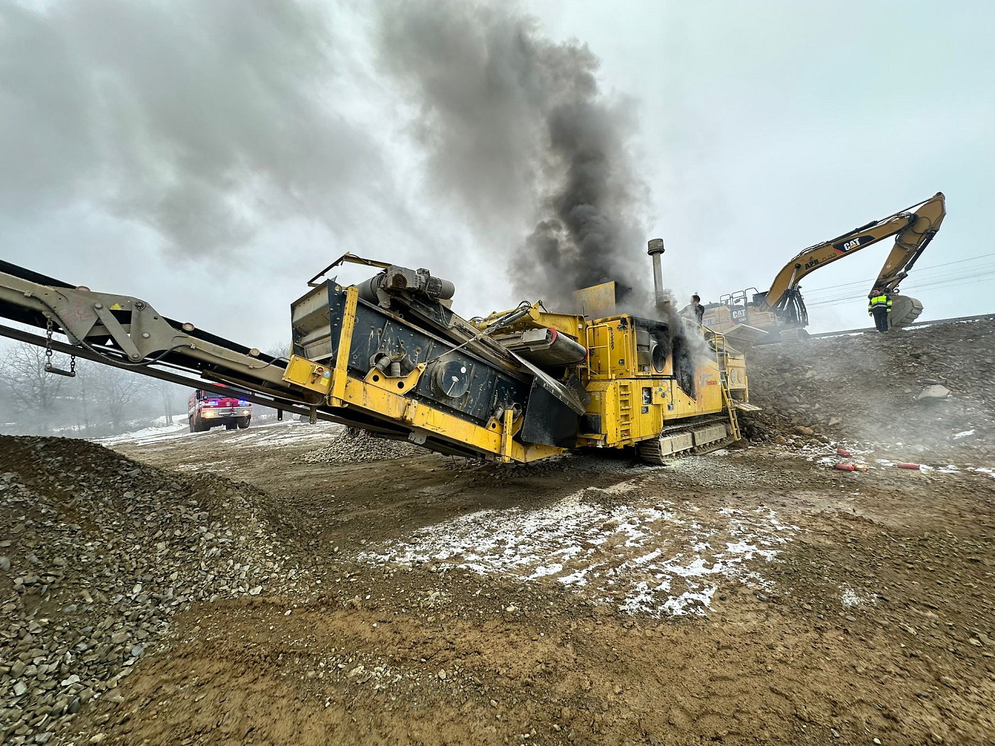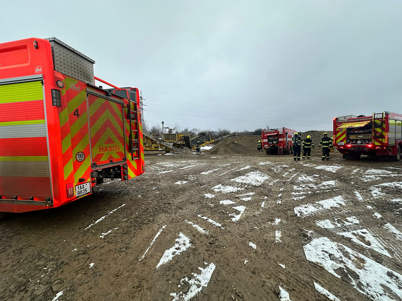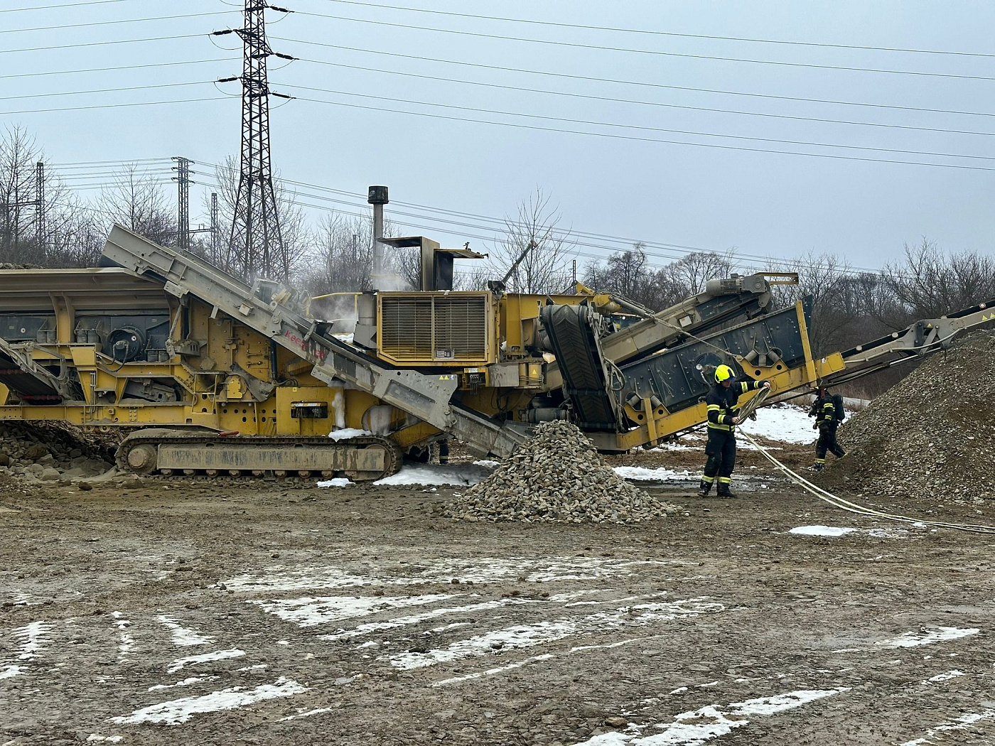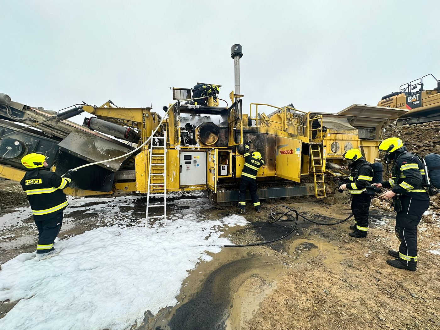 K požáru velkého zemního stroje (drtič kamene) na stavbě Pražského okruhu vyjeli v rámci mezikrajské spolupráce necelou hodinu po poledni na pomoc pražským kolegům z hasičské stanice Chodov a dobrovolným z Kolovrat profesionální hasiči z Říčan.