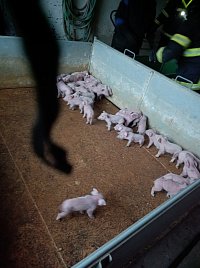 Profesionální hasiči z Prachatic a Křemže a dvě jednotky SDH zasahují ve Chvalovicích u požáru prasečáku. Ohnisko požáru našli ve střeše, odkud se valil černý kouř. Hasiči část prasat a selat evakuovali do již odvětrané haly.