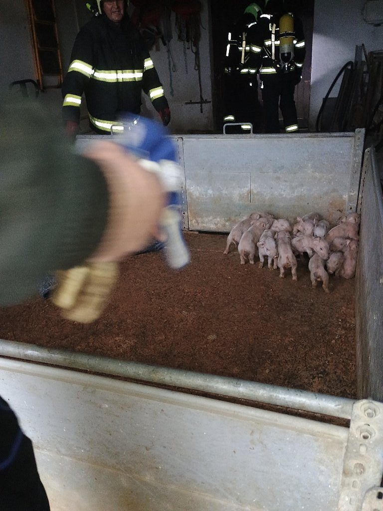 Profesionální hasiči z Prachatic a Křemže a dvě jednotky SDH zasahují ve Chvalovicích u požáru prasečáku. Ohnisko požáru našli ve střeše, odkud se valil černý kouř. Hasiči část prasat a selat evakuovali do již odvětrané haly.