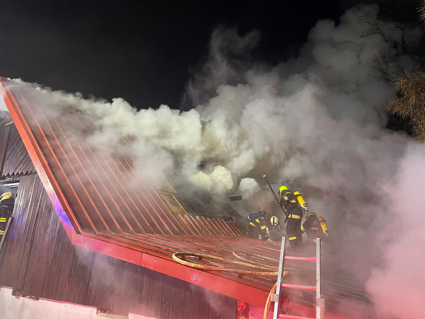 Hasební zásah pokračuje, velitel zásahu si vyžádal na místo další zásahovou techniku, ustaven je i automobilový žebřík. Do střechy hasiči vytváří otvory, aby snížili intenzitu hoření zejména v půdním prostoru. Na místním rybníku je zřízeno čerpací stanoviště.