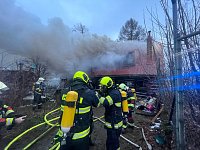 V katastru obce Liberk zasahují hasiči u požáru chalupy, k zásahu využívají i výškovou techniku