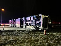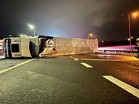Převrácený kamion přes tři pruhy zablokoval příjezd do Prahy po D1