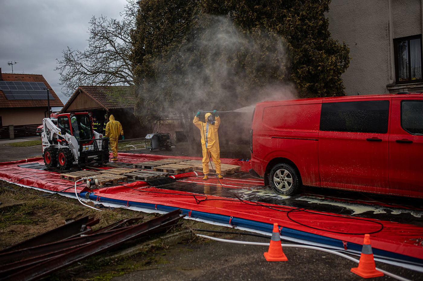 V areálu velkochovu kachen začaly jednotky pracovat po 7. hodině ranní přípravou jednotlivých stanovišť, likvidační práce byly ukončeny ve 14 hodin. Během odpoledních hodin probíhala ještě desinfekce hal, dekontaminace využívané techniky a balení prostředků.