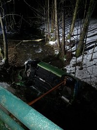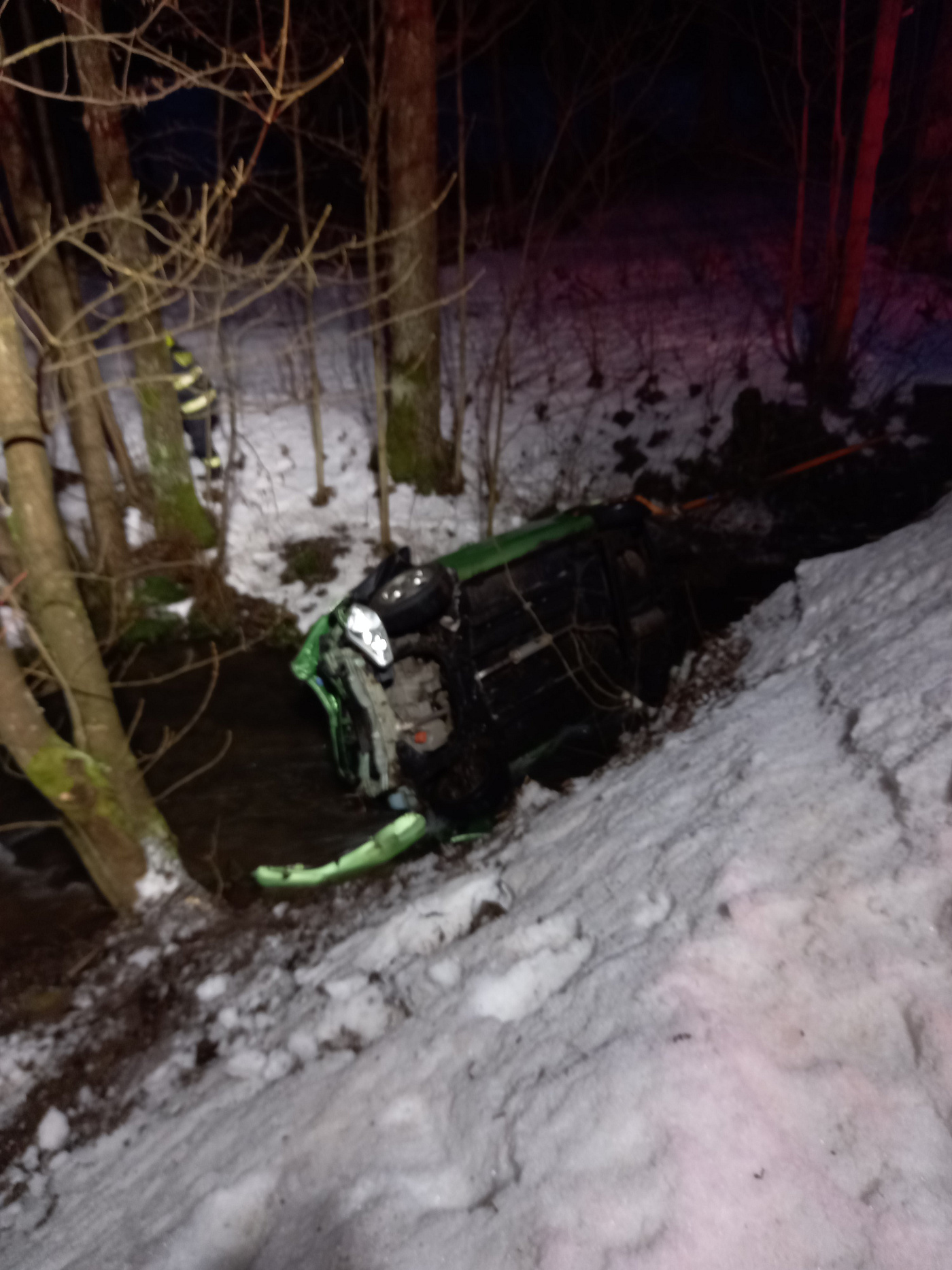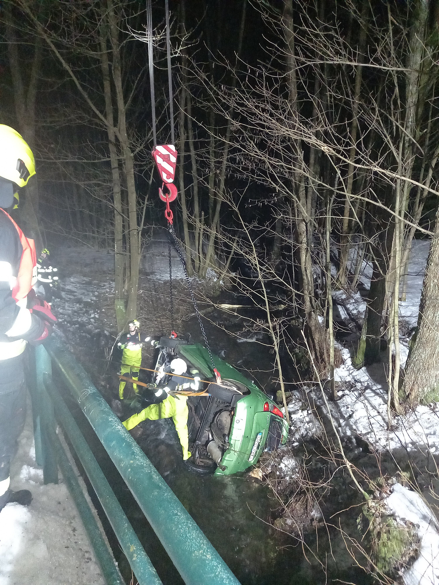 Osobní vozidlo sjelo ze silnice do potoka a převrátilo se na bok. Zraněný řidič skončil v péči zdravotnické záchranné služby. K vyproštění vozidla z potoka použili hasiči jeřáb.