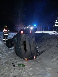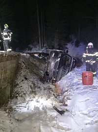 Bez zranění vyvázla čtyřčlenná osádka osobního automobilu po nehodě u Bartošovic v Orlických horách. Vozidlo narazilo do mostku a skončilo na boku mimo komunikaci. Unikající pohonné hmoty jímali hasiči pomocí sorpčních hadů, k vyproštění vozidla musel být povolán jeřáb.