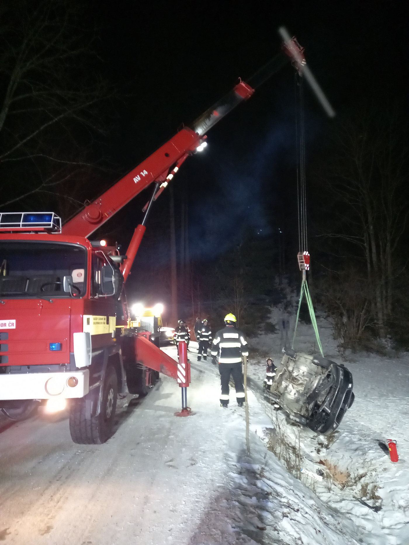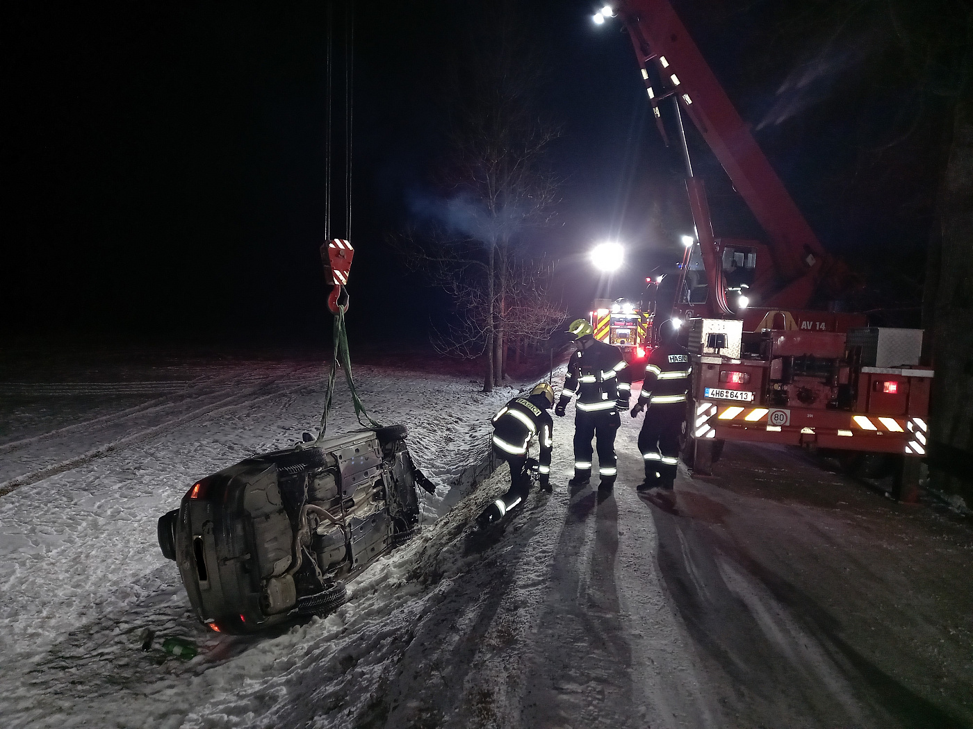 Bez zranění vyvázla čtyřčlenná osádka osobního automobilu po nehodě u Bartošovic v Orlických horách. Vozidlo narazilo do mostku a skončilo na boku mimo komunikaci. Unikající pohonné hmoty jímali hasiči pomocí sorpčních hadů, k vyproštění vozidla musel být povolán jeřáb.