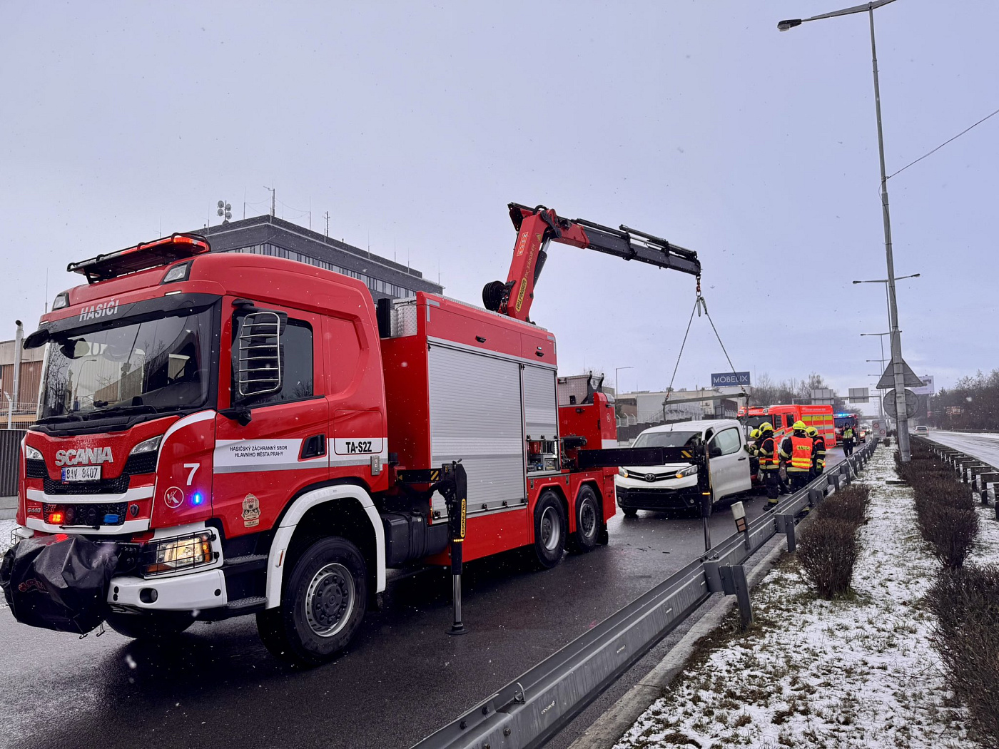 Na místo byl povolán technický automobil s rukou z důvodu zaklínění dvou vozidel. Dále hasiči provádí úklid vozovky a odstranění aut mimo komunikaci.