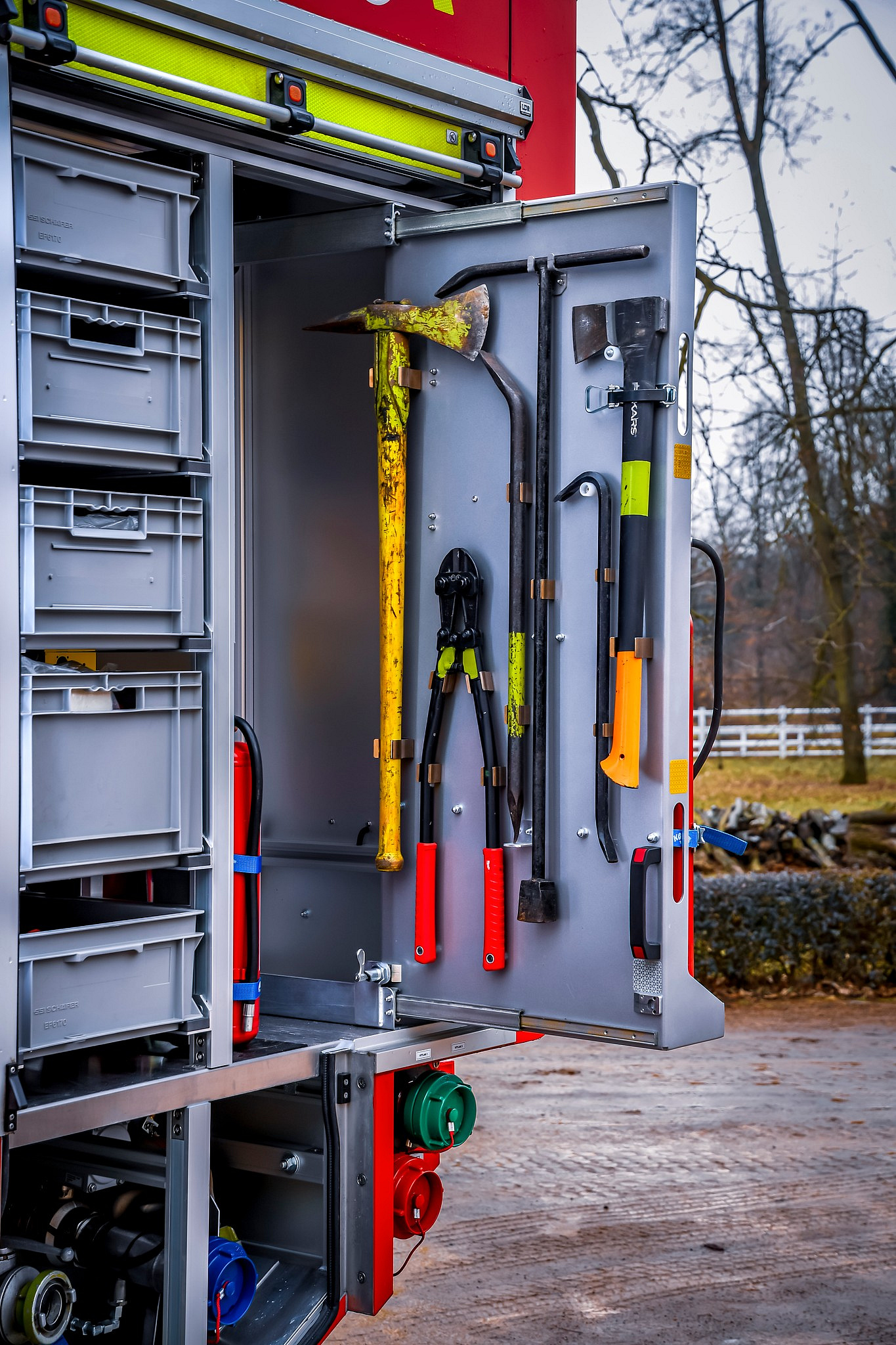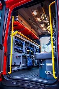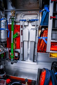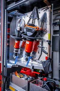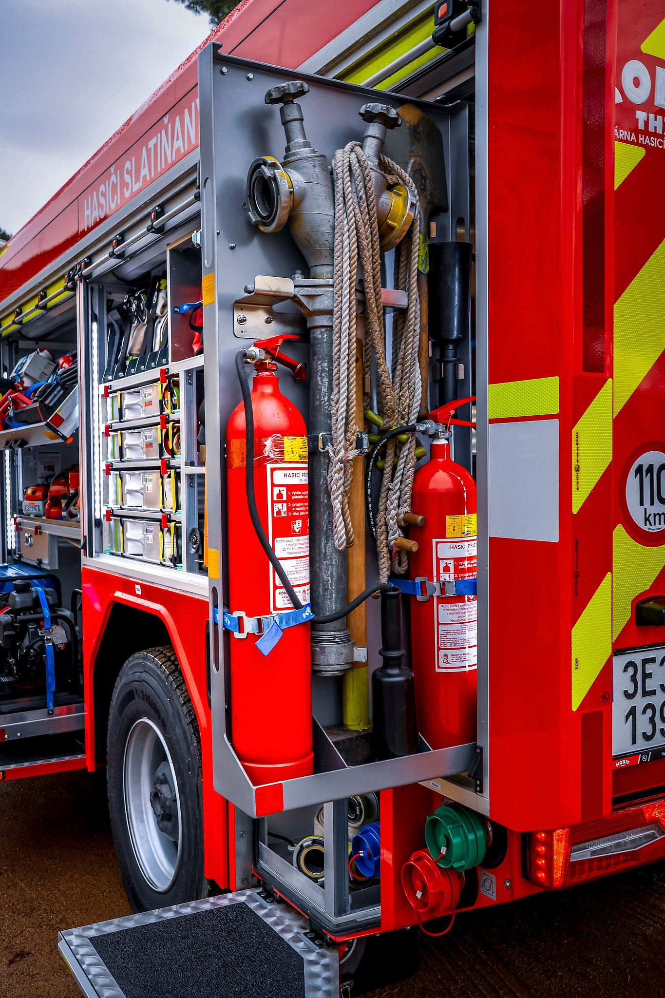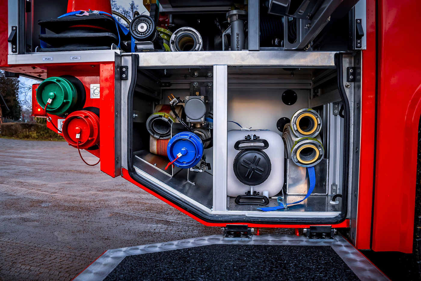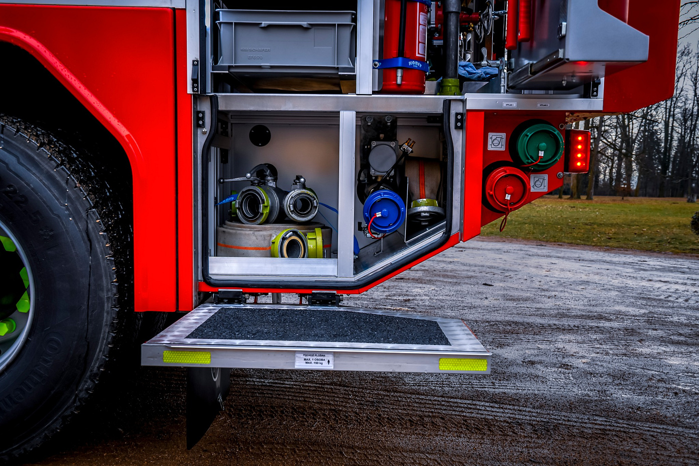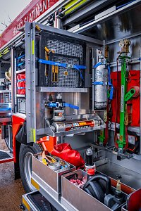 Úložné prostory pro požární příslušenství jsou přístupné ze tří stran. Na každém boku je trojice schrán krytá hliníkovými roletkami s průběžným madlem, v zadní části jsou pak výklopné dveře pro přístup k čerpacímu zařízení.