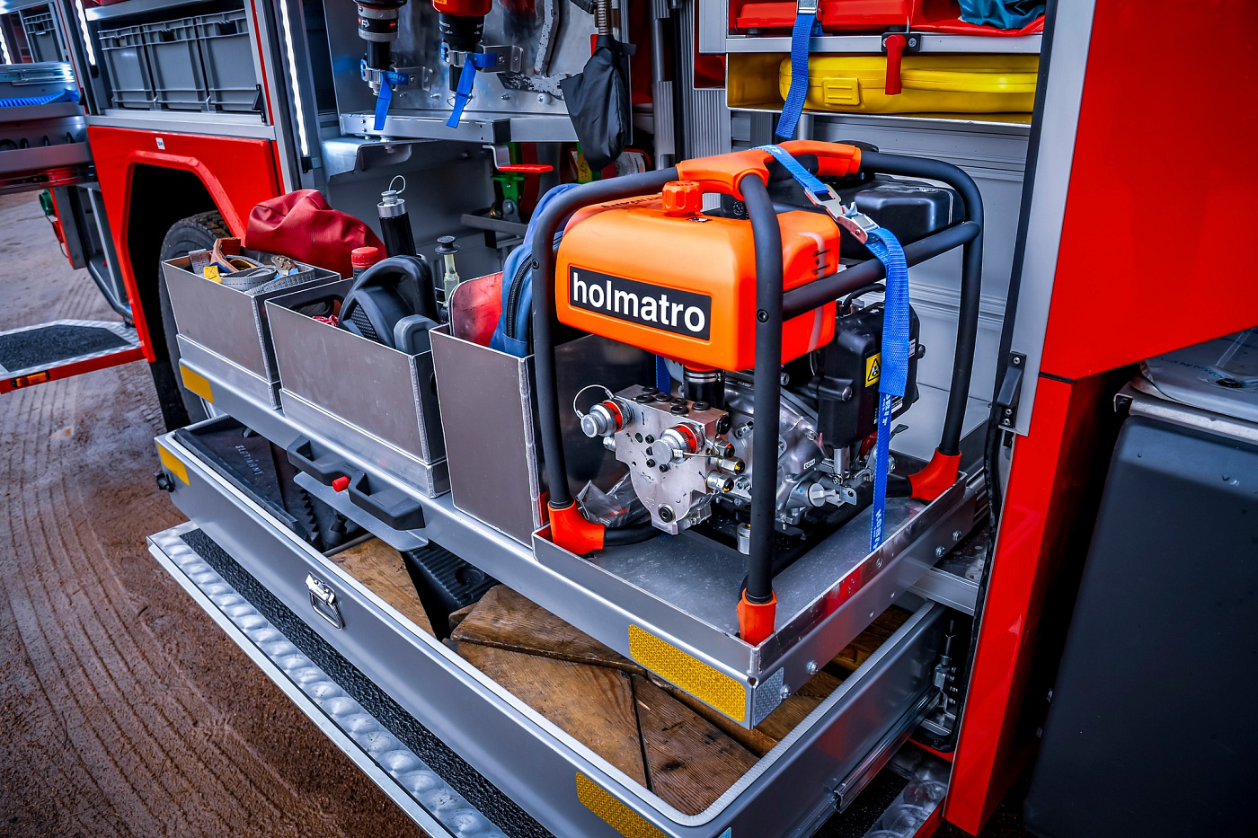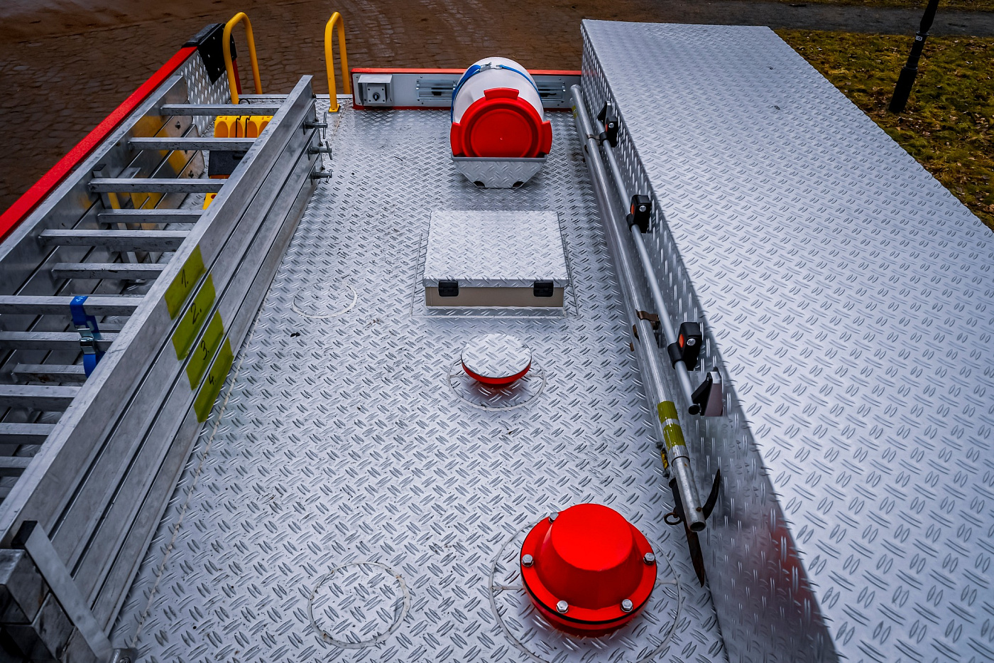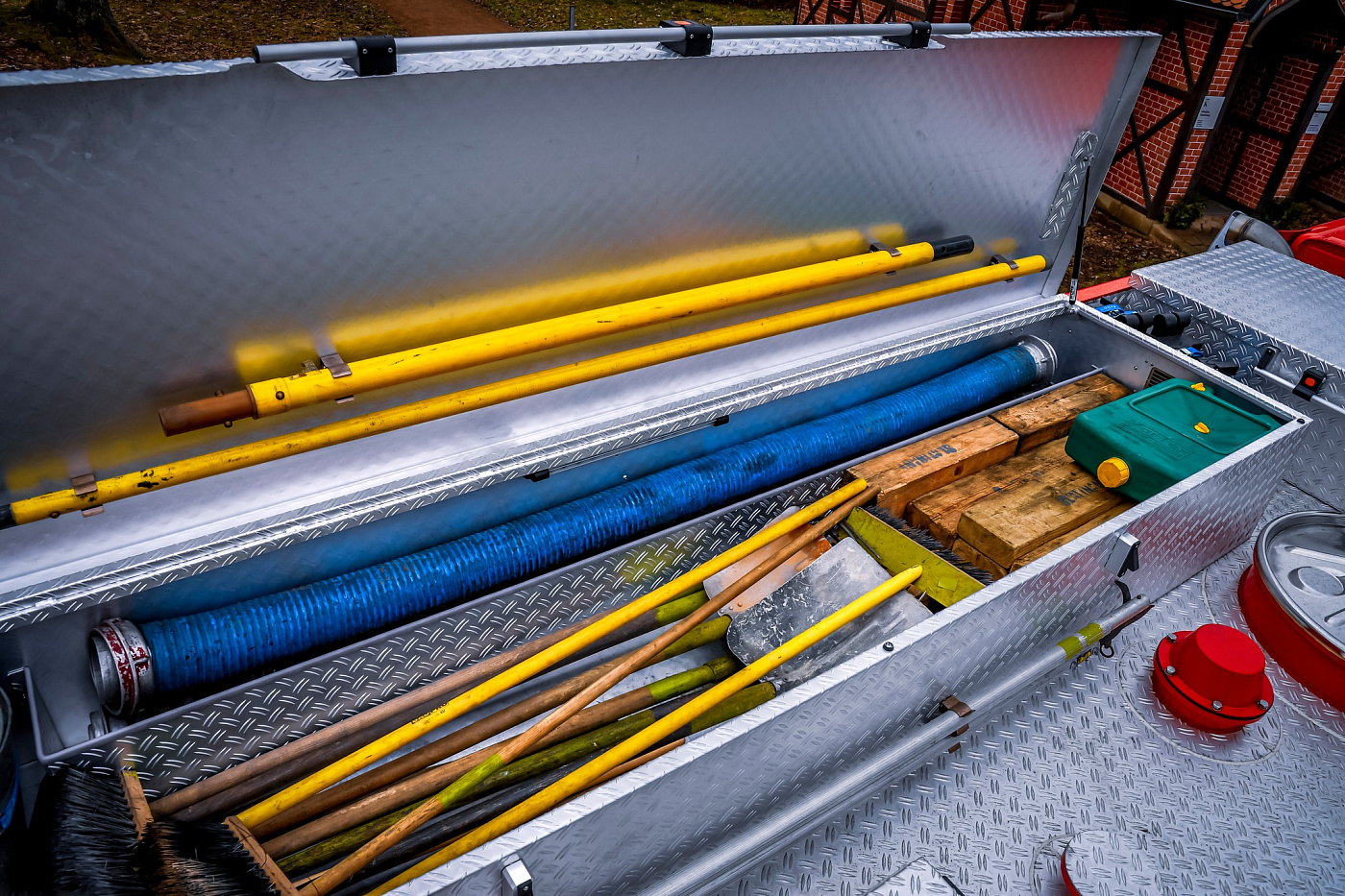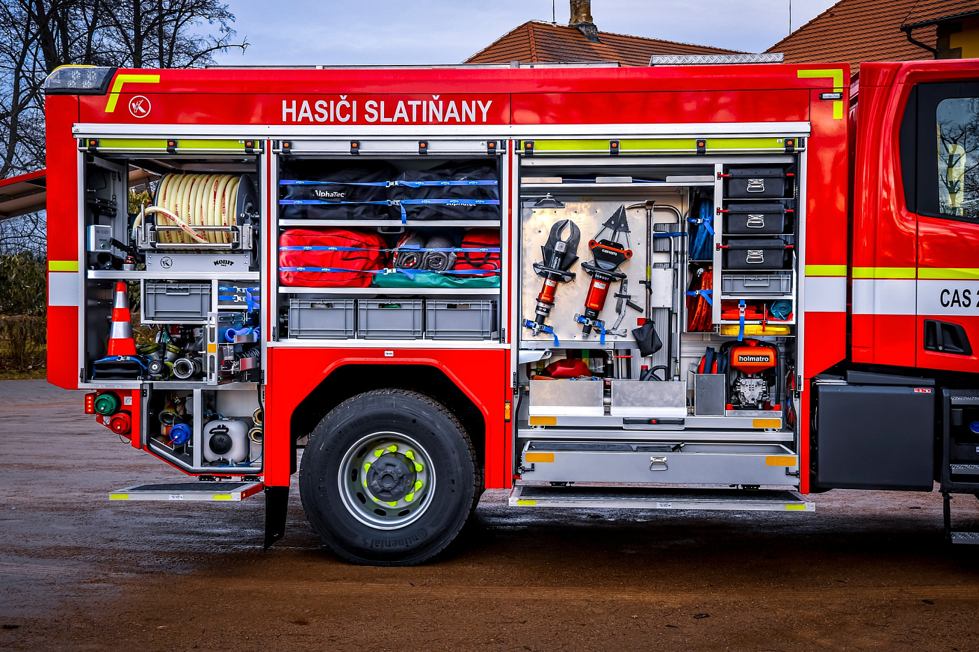 Úložné prostory pro požární příslušenství jsou přístupné ze tří stran. Na každém boku je trojice schrán krytá hliníkovými roletkami s průběžným madlem, v zadní části jsou pak výklopné dveře pro přístup k čerpacímu zařízení.
