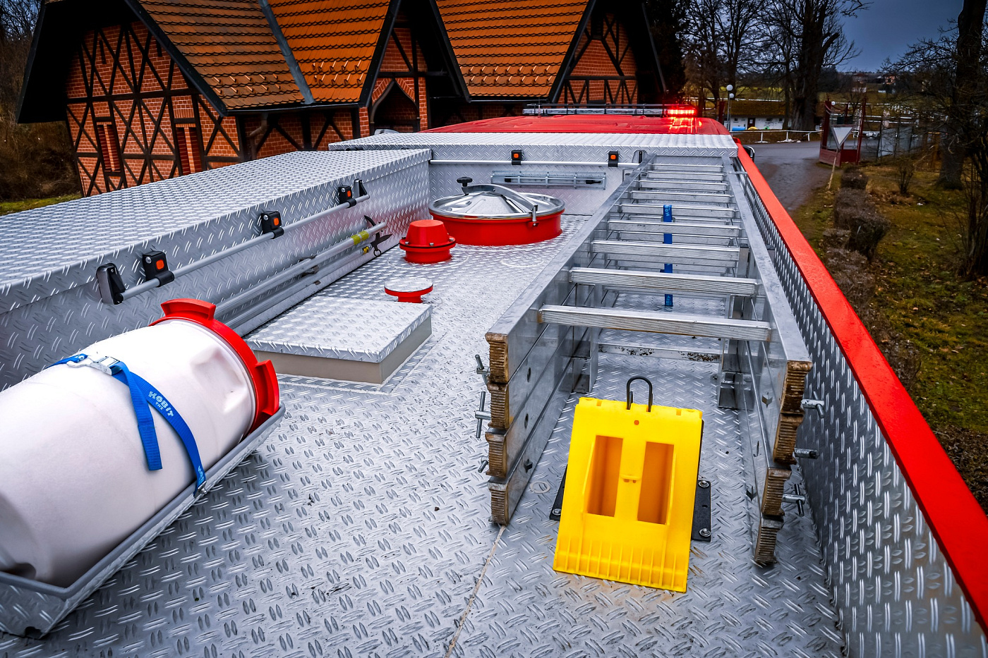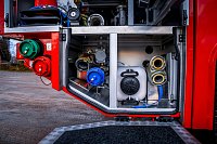 Nádrž na hasivo tvoří jeden celek z nerezavějící oceli. Scania ve svých útrobách veze 4000 litrů vody a 240 litrů pěnidla.