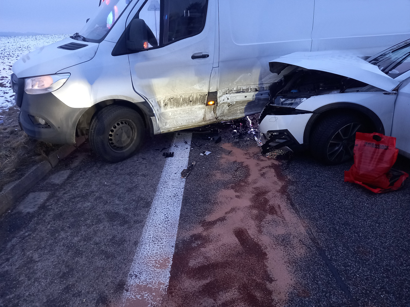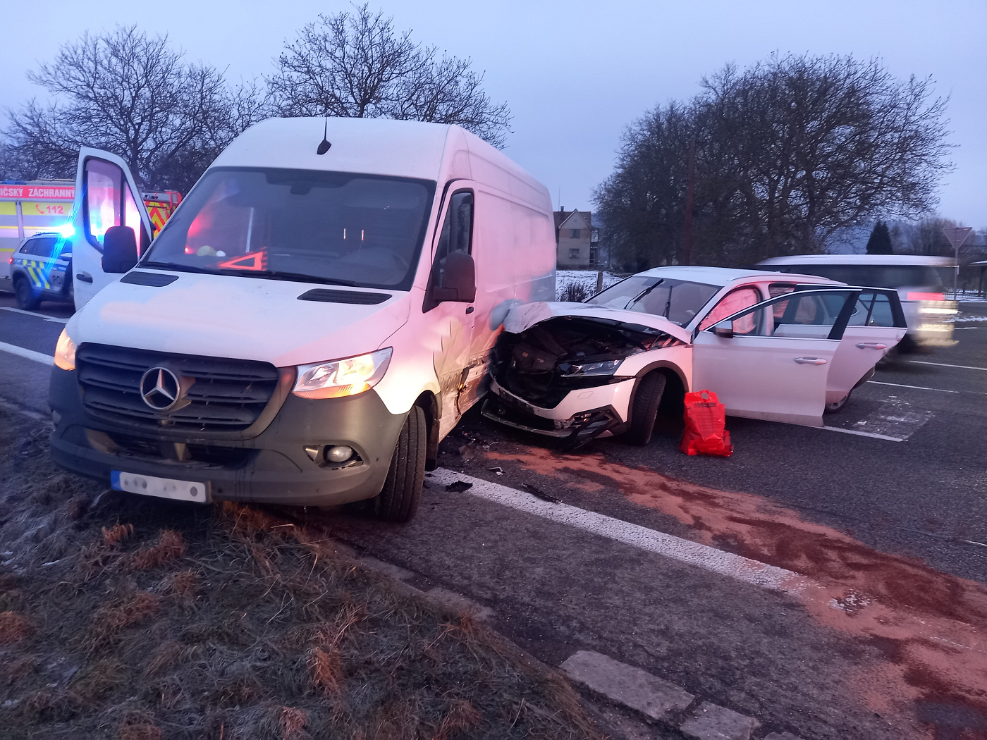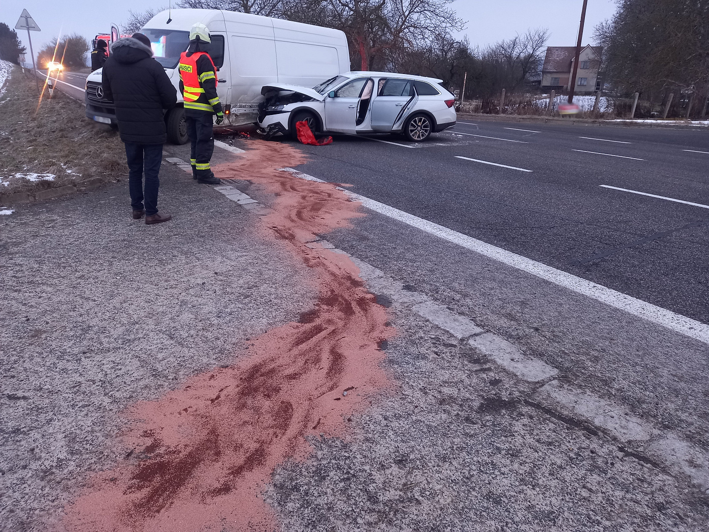 V obci Holín se srazil osobák s dodávkou. Operační středisko na místo vyslalo profesionální jednotku hasičů z Jičína. Hasiči zabezpečili vozidla proti požáru a pomocí sorbentu jímají unikající chladící kapalinu. Nehoda se obešla bez zranění osob.