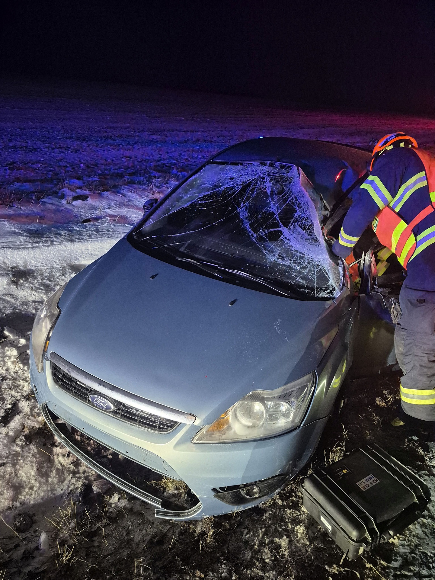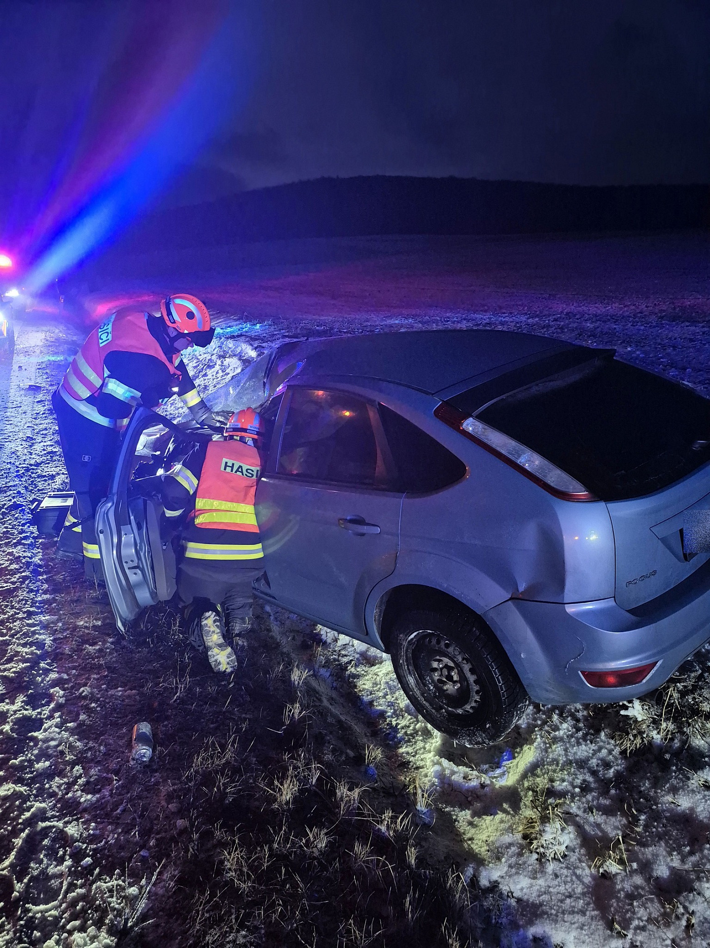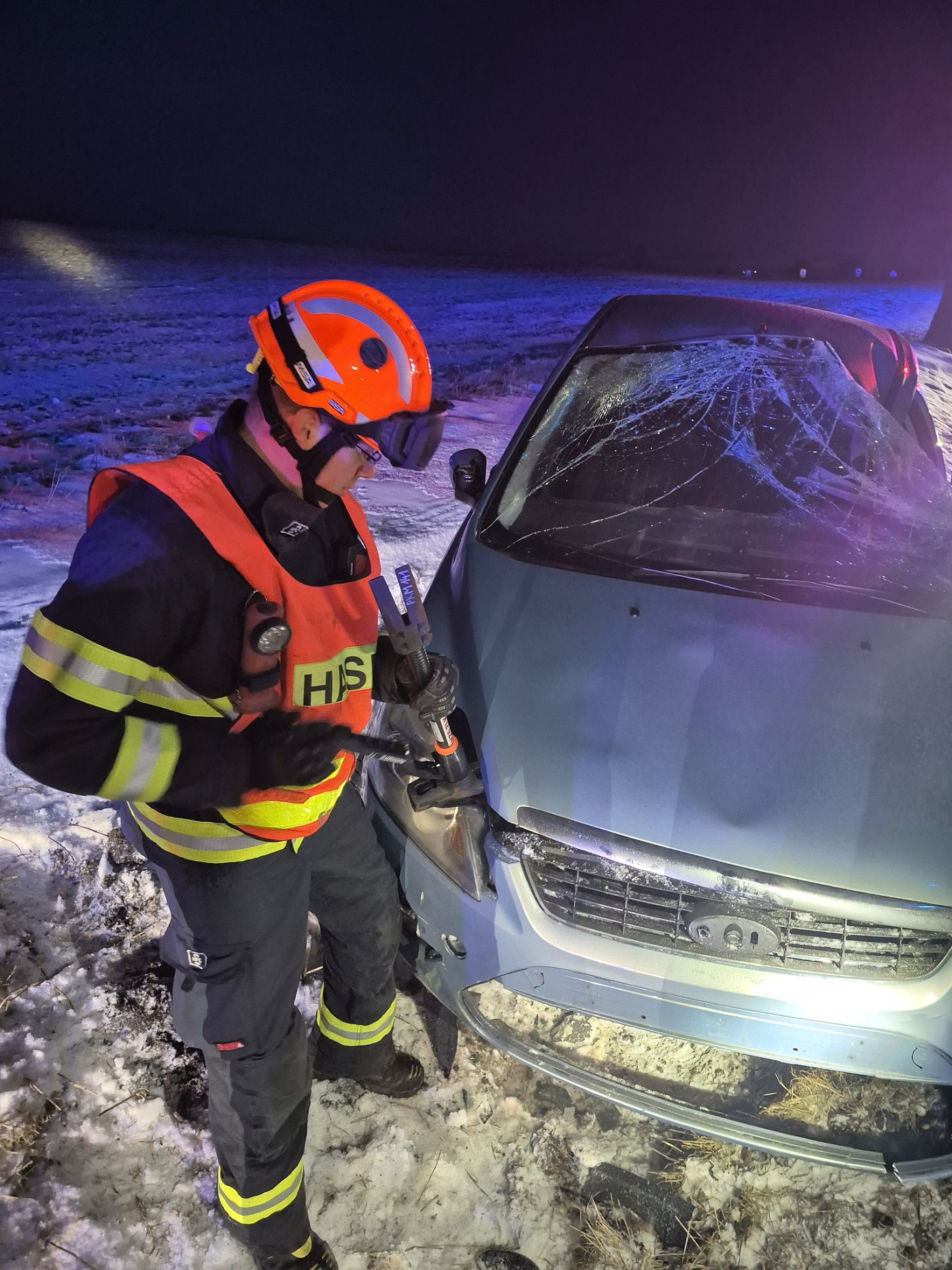 Na místo události byli vysláni profesionální hasiči ze stanice Morkovice-Slížany. Po příjezdu provedli průzkum místa nehody a zabezpečili havarované vozidlo proti vzniku požáru. Součástí protipožárních opatření bylo odpojení autobaterie. Vzhledem k poškození přední kapoty však nebyl přístup k baterii možný běžným způsobem, a hasiči proto museli použít multifunkční nástroj.
