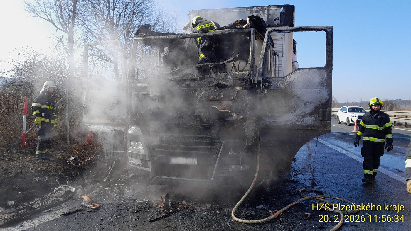 Na dálnici D5 na sjezdu k čerpací stanici u Rokycan hasiči likvidovali požár nákladního automobilu. Oheň zasáhl kabinu a část návěsu. Náklad by měly dle informací z místa být role papíru.