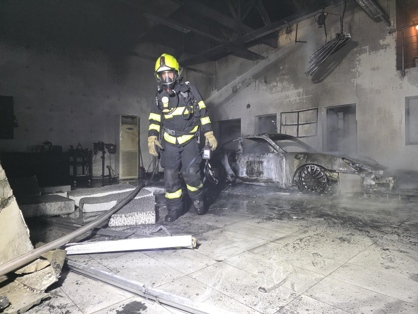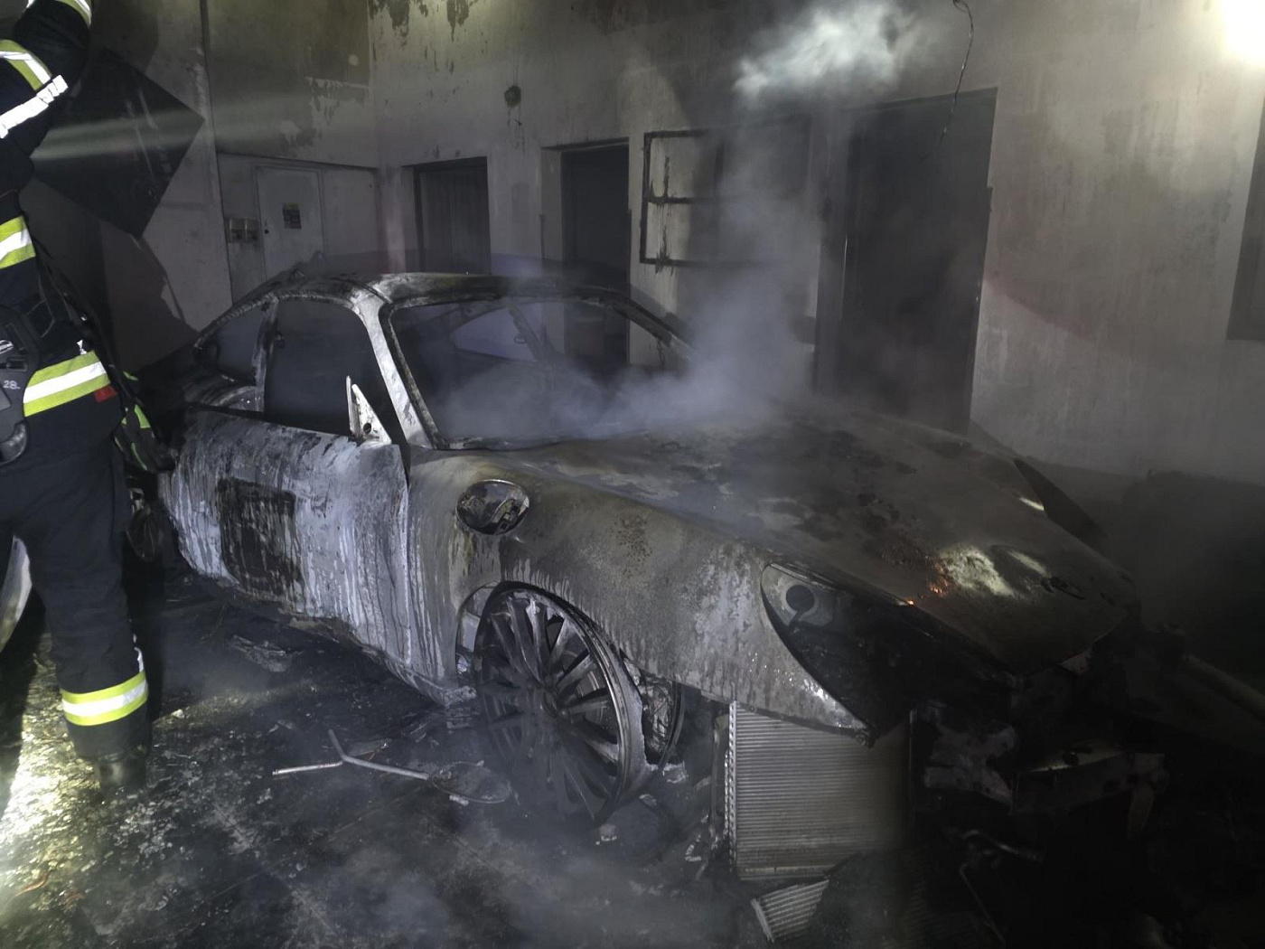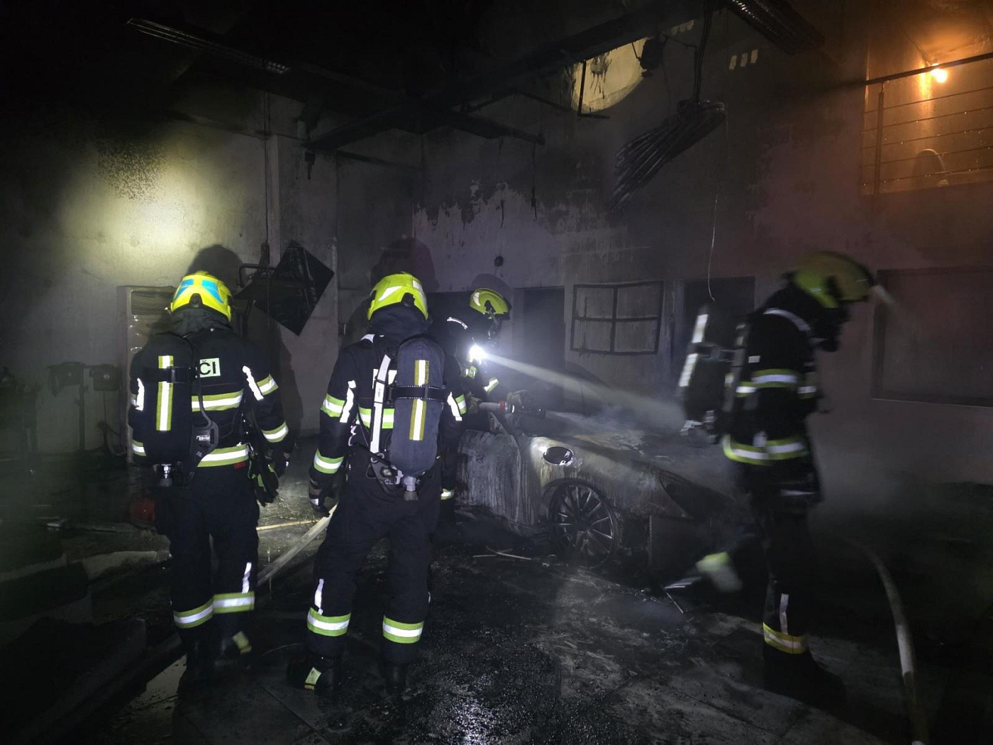 Vlivem sálavého tepla z požáru byla poničena částečně také střecha objektu – světlíky ve střešní konstrukci nad automobilem, který byl v plamenech. Pětadvacet minut po půlnoci měli hasiči požár pod kontrolou, velitel zásahu nahlásil na operační středisko lokalizaci a o hodinu později úplnou likvidaci požáru. Při dohašovacích pracích hasiči využili termokamery pro vyhledávání skrytých ohnisek a kontrolu, nasadili také přetlakovou ventilaci na odvětrání zplodin hoření z velkého objektu. Odvětrávali také přirozeně.