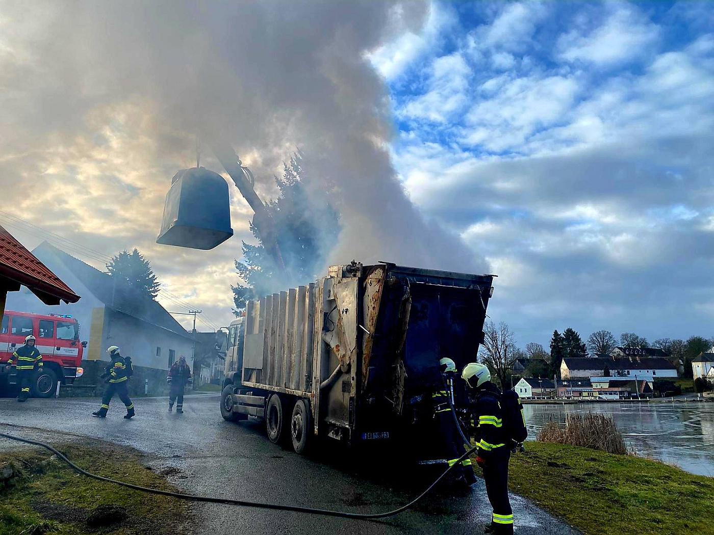 Hořící papírový odpad v popelářském voze zaměstnává hasiče v Jickovicích. Museli do vozu proříznout dva otvory, kterými dostali požár pod kontrolu.