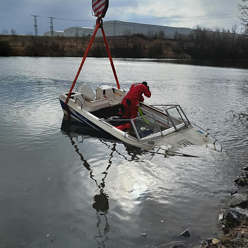 Hasiči pomocí automobilového jeřábu vyprostili potopený člun v Kněževsi