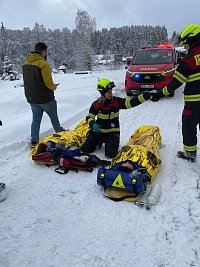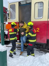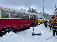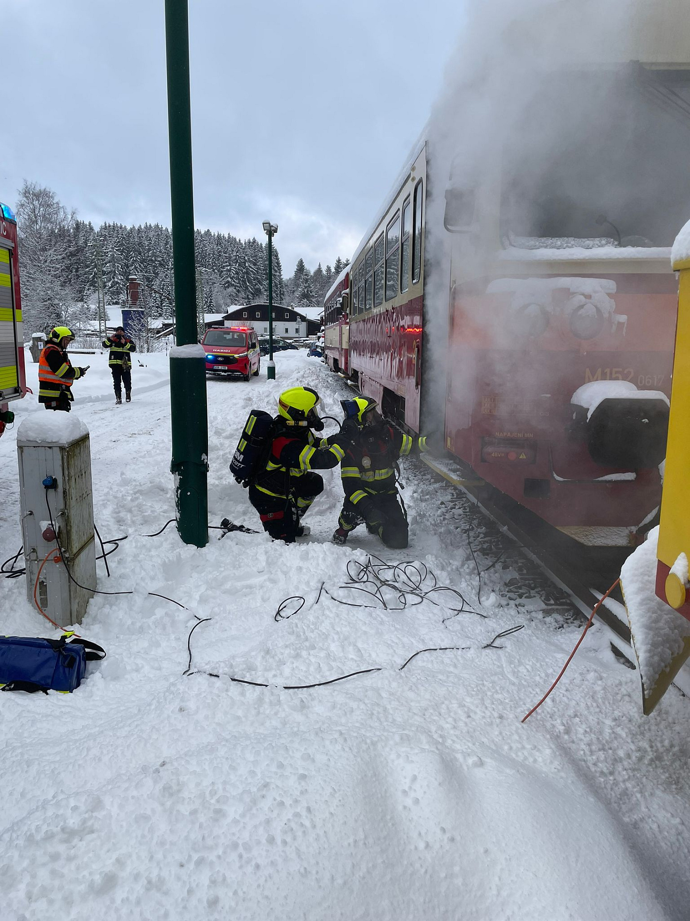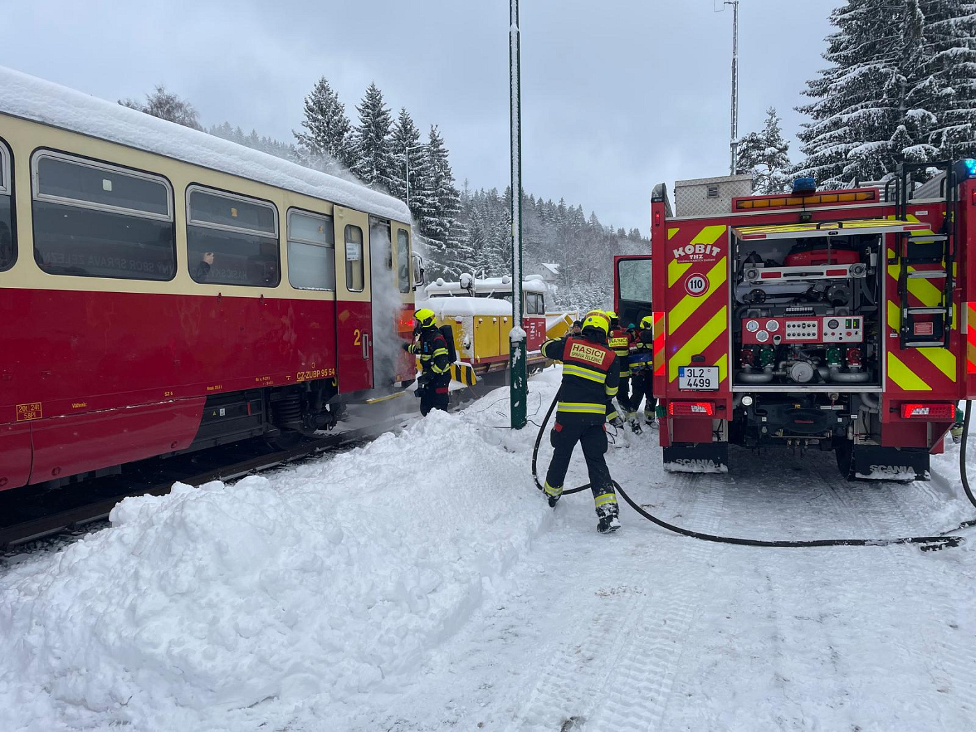 Drážní hasiči z Liberce trénovali zásah při požáru elektrokoloběžky ve vagonu zubačky