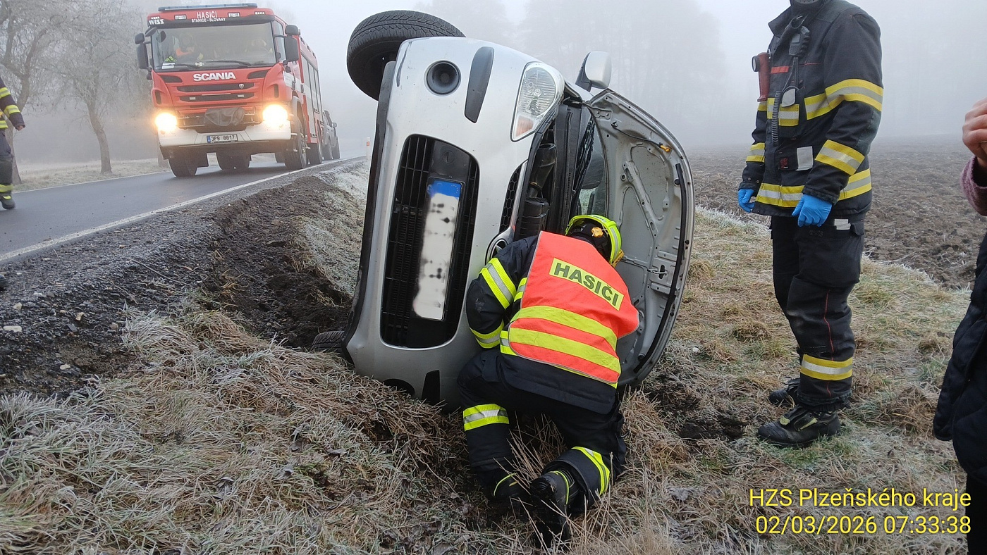 Mezi Starým Plzencem a Šťáhlavy havarovalo mimo vozovku jedno osobní auto. Hasiči provádí protipožární opatření. Nehoda je bez zranění.
