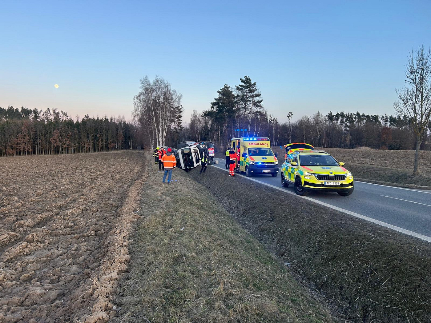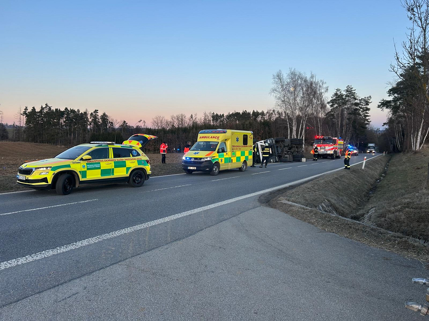 Komunikaci II/151 z Dačic na Hostkovice blokuje nehoda převráceného nákladního vozu. K nehodě došlo patnáct minut po sedmnácté hodině. Řidič vozidlo opustil před příjezdem složek IZS. I tak skončil v péči zdravotníků po vyšetření byl ponechán na místě bez nutnosti transportu do nemocnice.