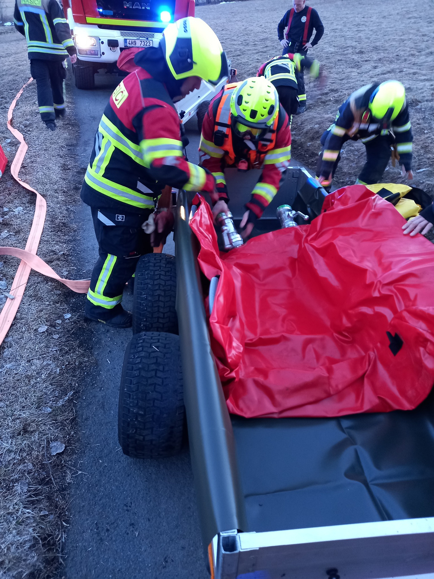 Požár se nacházel ve velmi obtížně přístupném terénu, kam nebylo možné dojet běžnou cisternovou technikou. Na místo se hasiči dostali pomocí čtyřkolek a terénních vozidel, kterými dopravili přenosnou nádrž s čerpadlem.