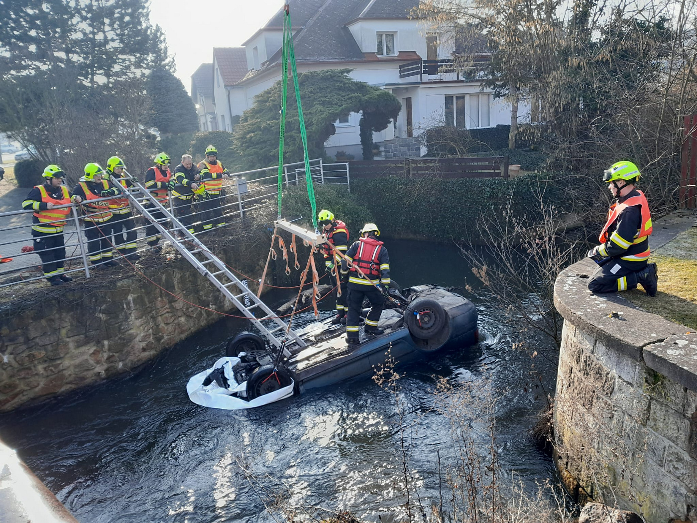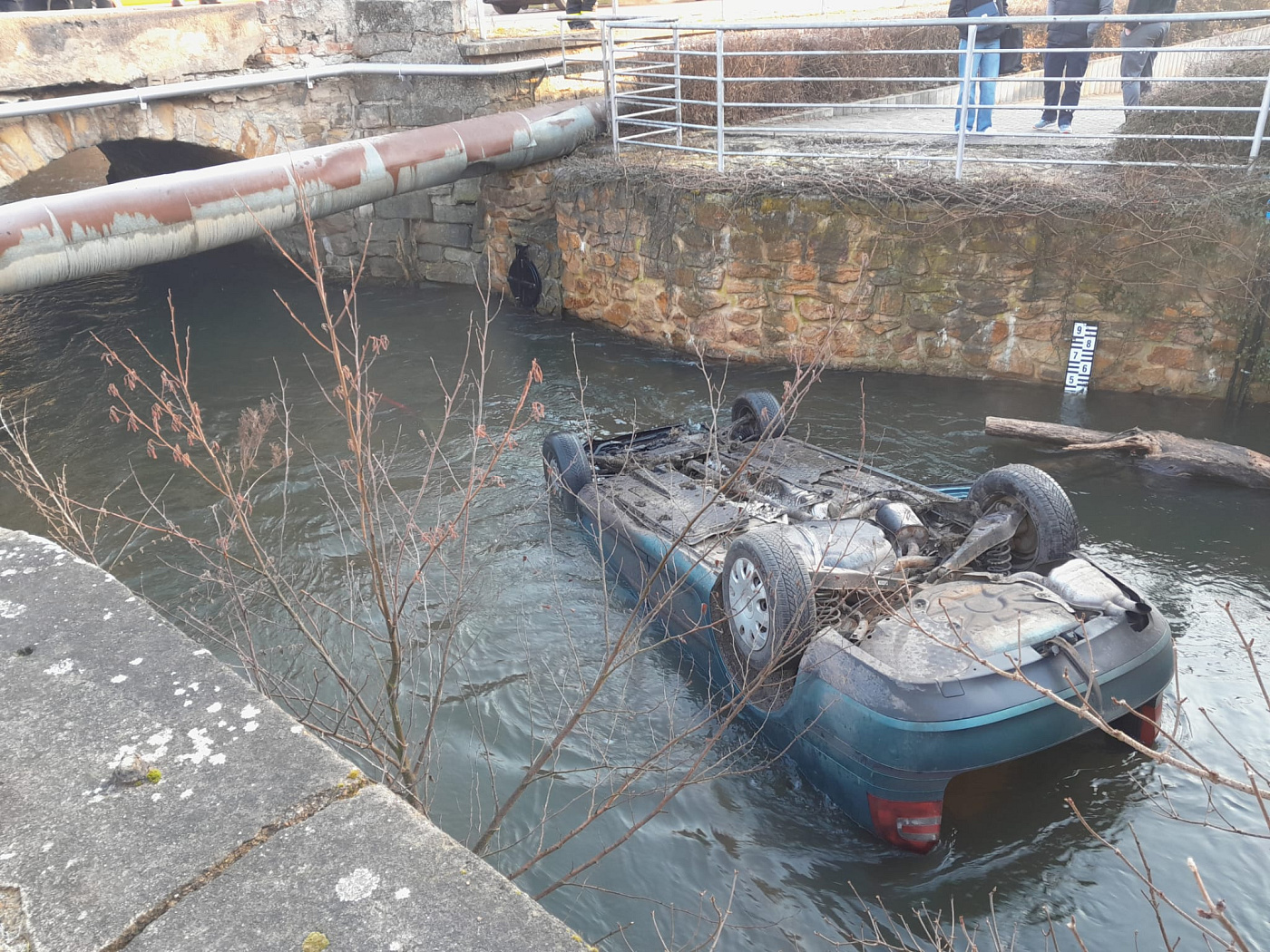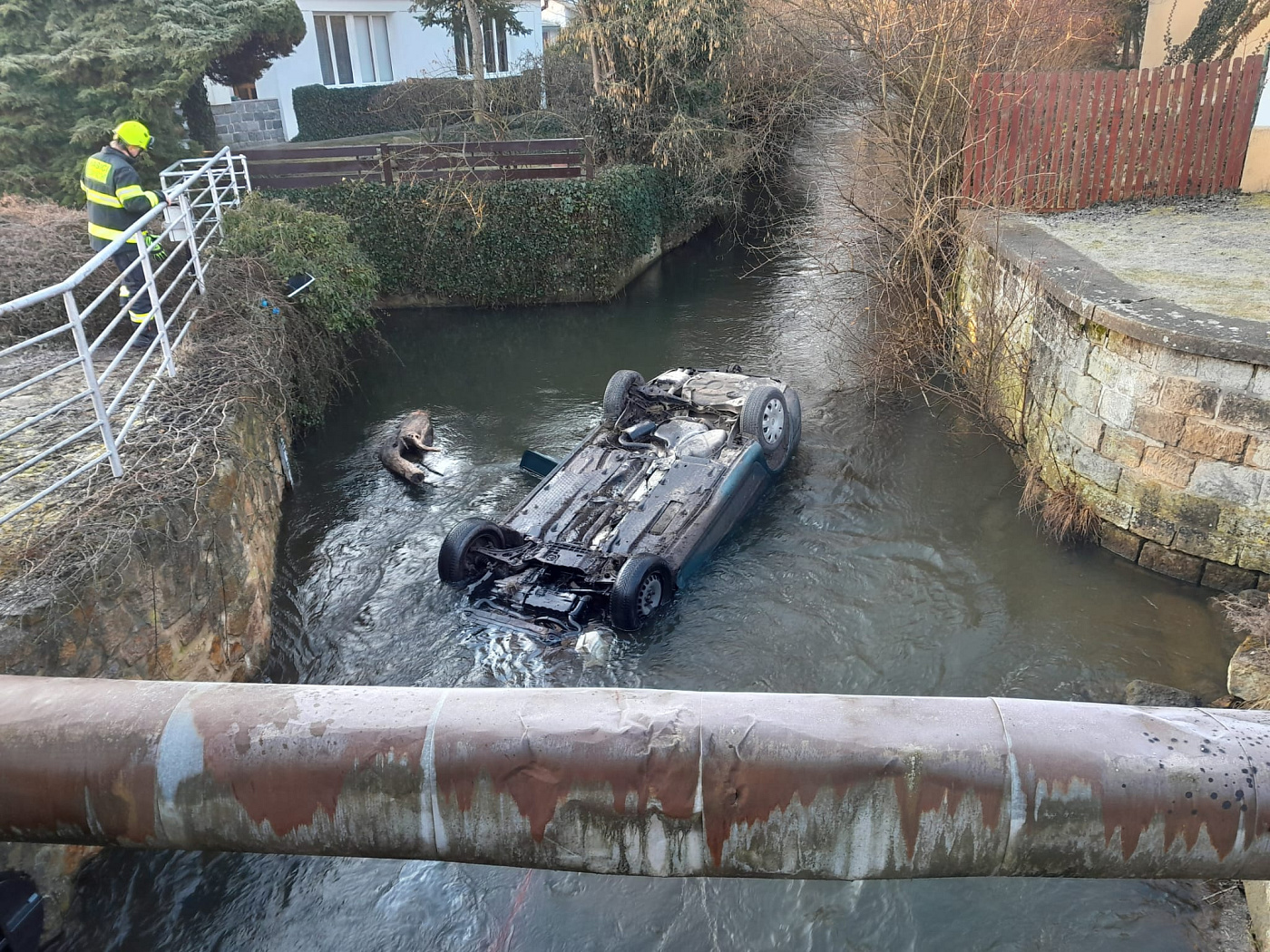 Osobní vozidlo skončilo v Brozanech nad Ohří převrácené na střeše v potoce