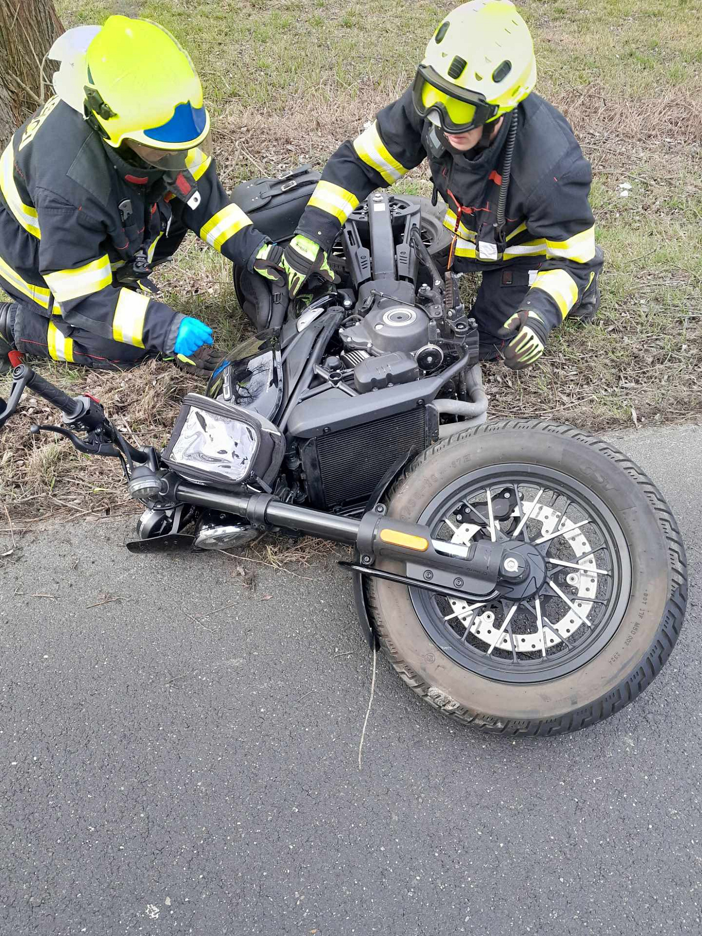 K dopravní nehodě motocyklu se zraněním vyjeli pár minut před půl třetí do obce Těchlovice na Děčínsku profesionální hasiči ze stanice Děčín společně s jednotkou SDH obce Malé Březno.