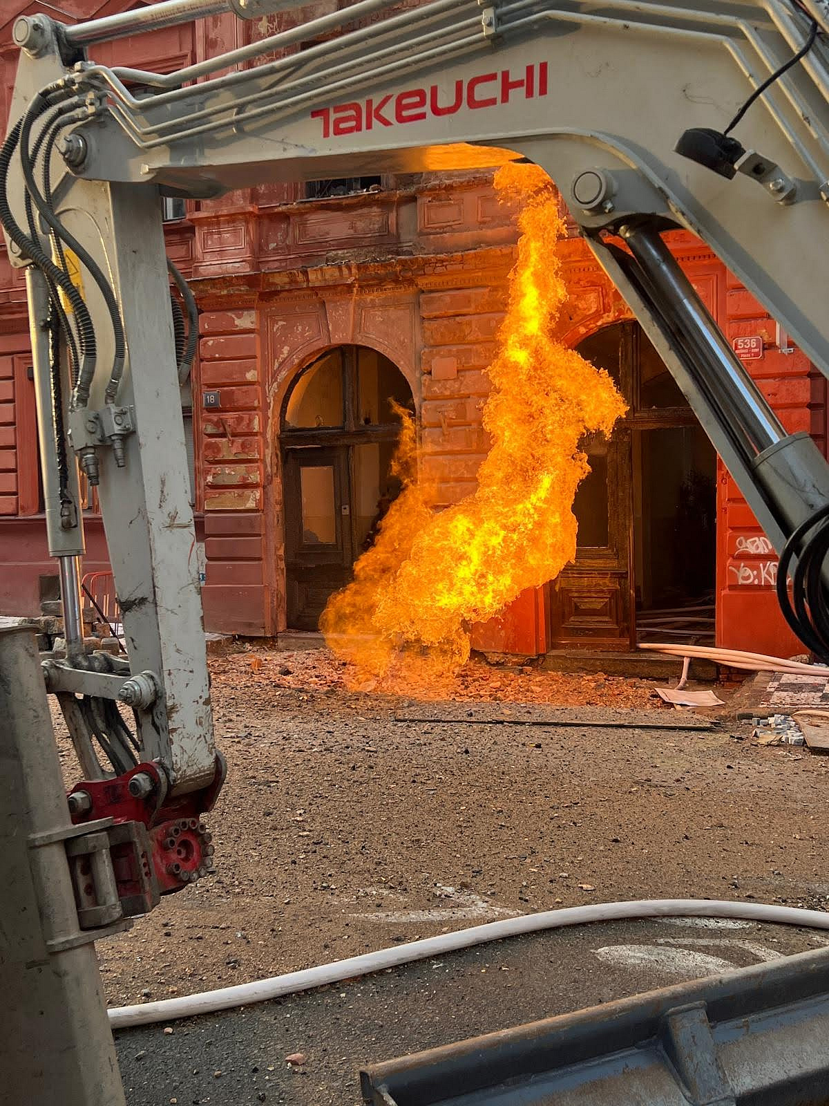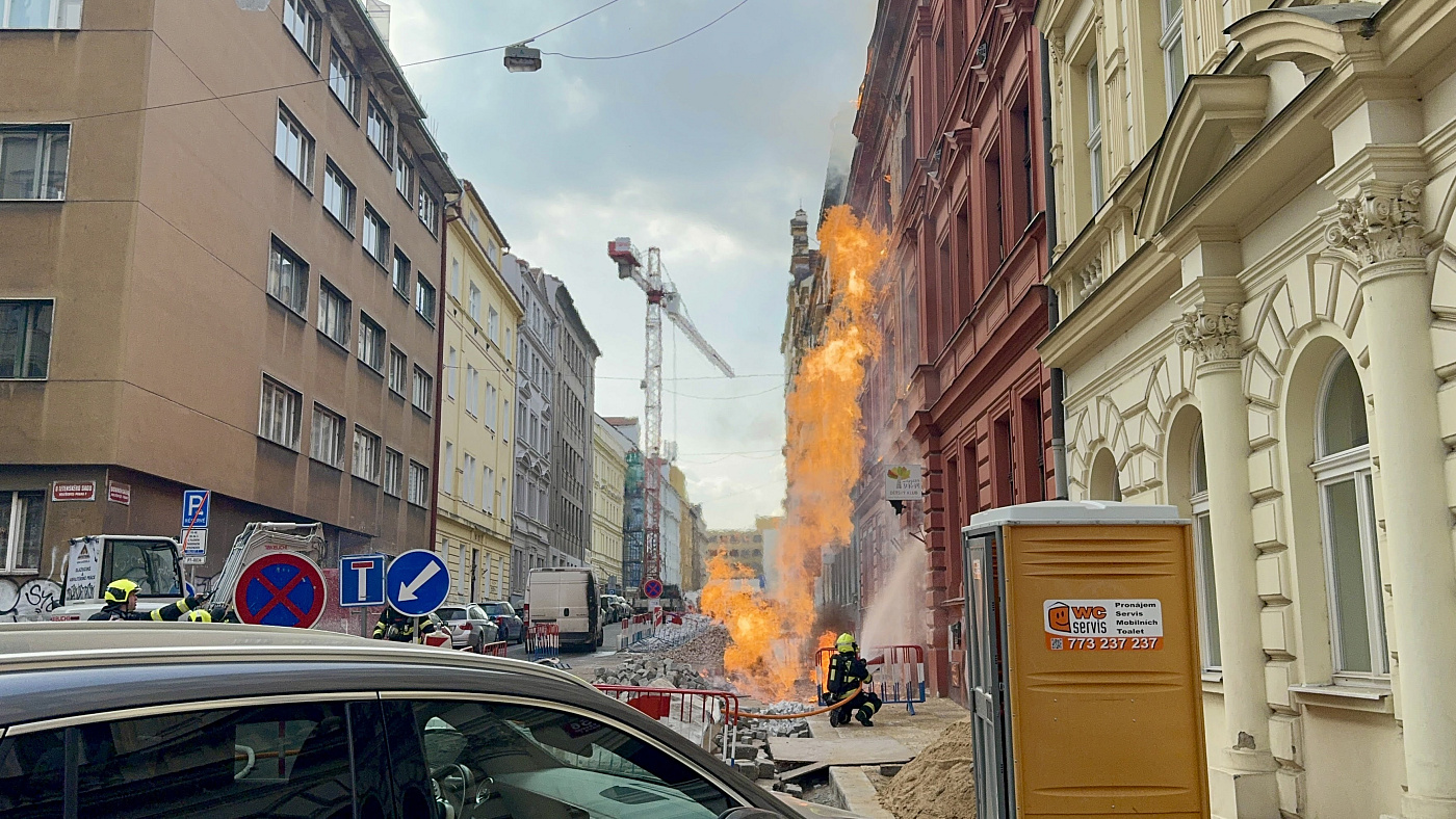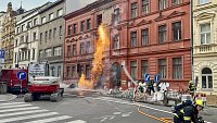 V Praze na Letné hořelo narušené plynové potrubí, plameny dosahovaly několika metrů