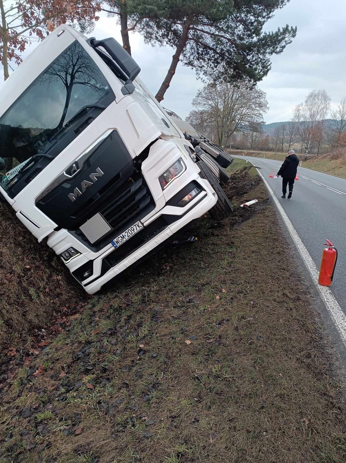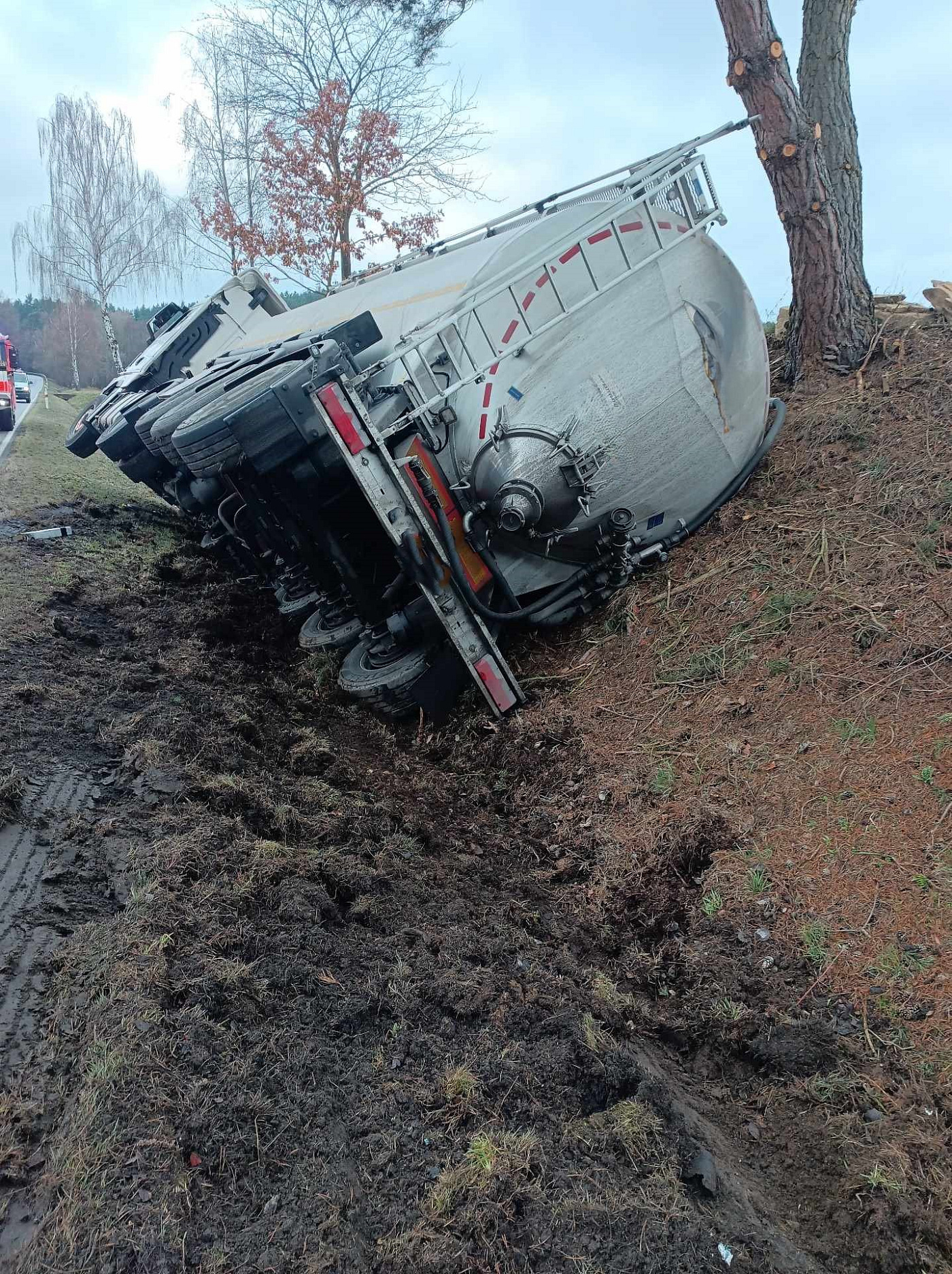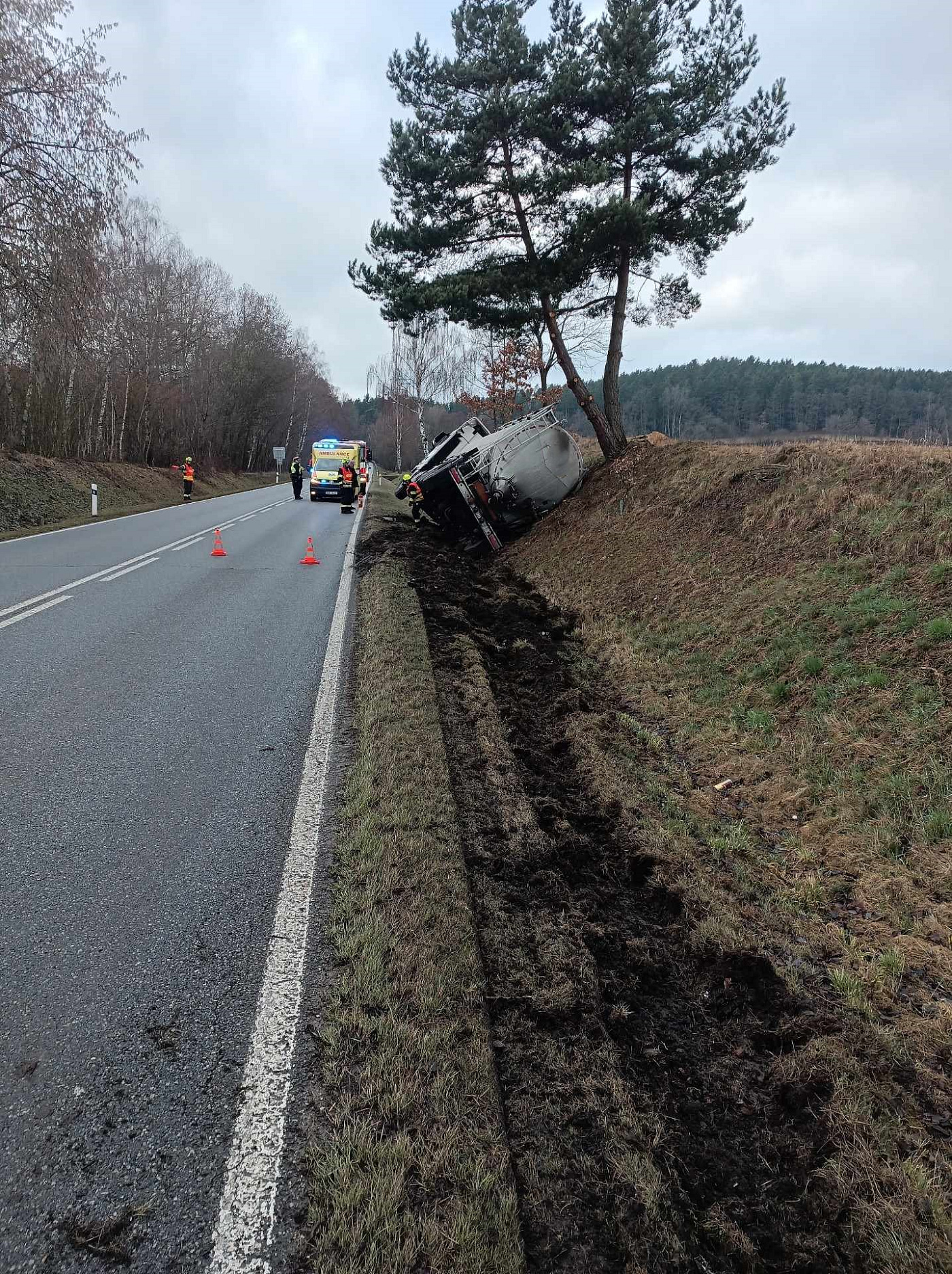 Prachatičtí profi hasiči pomáhají s probíhajícím vyproštěním převrácené cisterny u Vitějovic. Kontrolují především případný únik provozních látek.