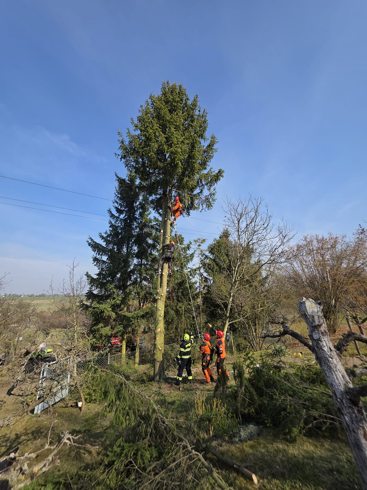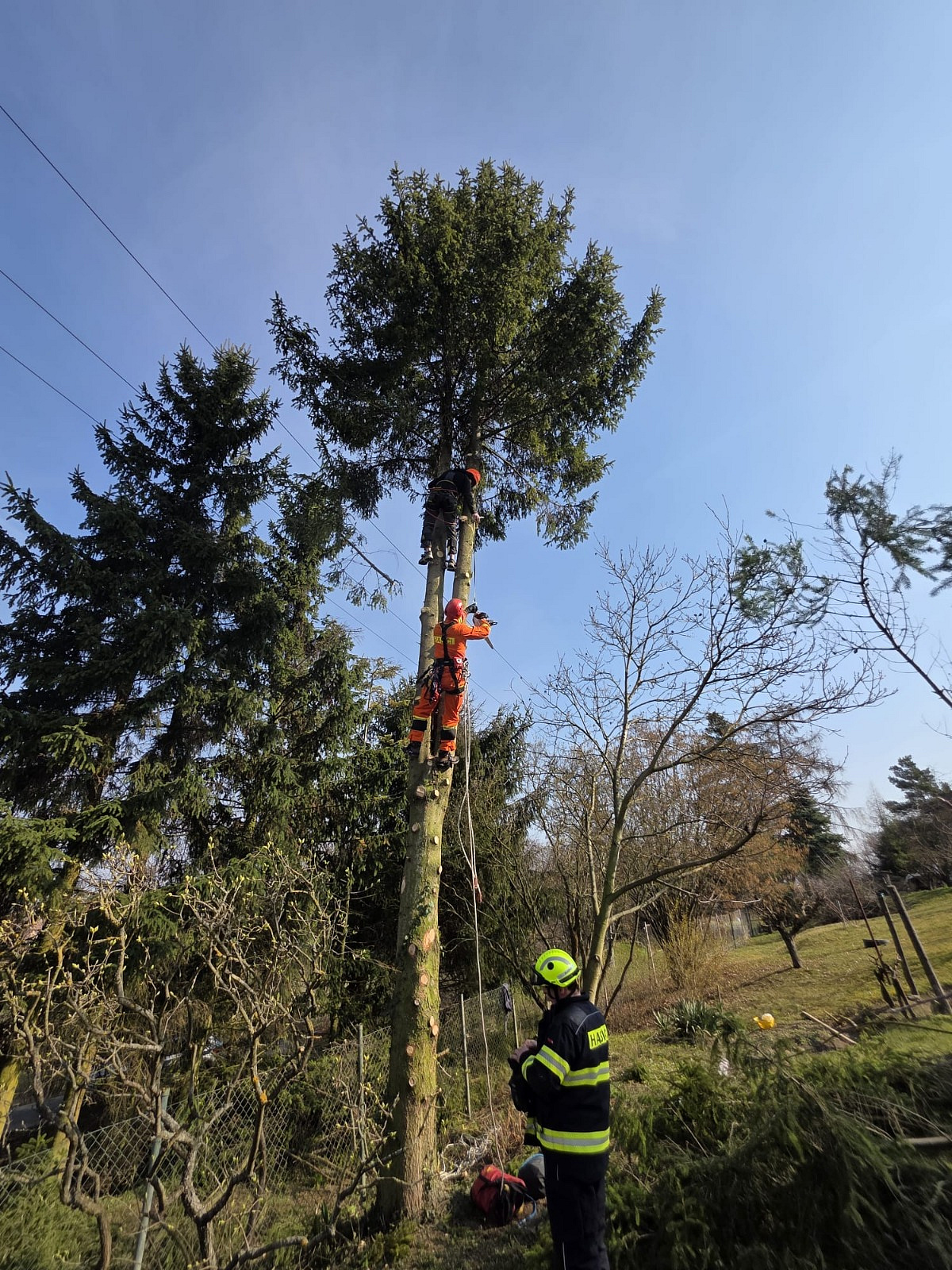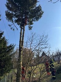 K záchraně osoby, která uvízla na stromě ve výšce cca 6 metrů v Makotřasech po úrazu elektrickým proudem, vyjela kladenská profesionální jednotka včetně lezeckého družstva a automobilového žebříku a také místní dobrovolná jednotka Hřebeč.