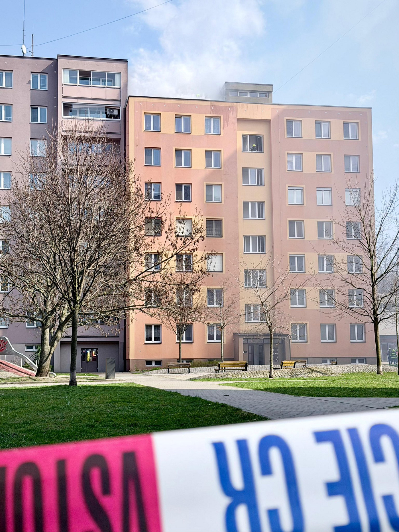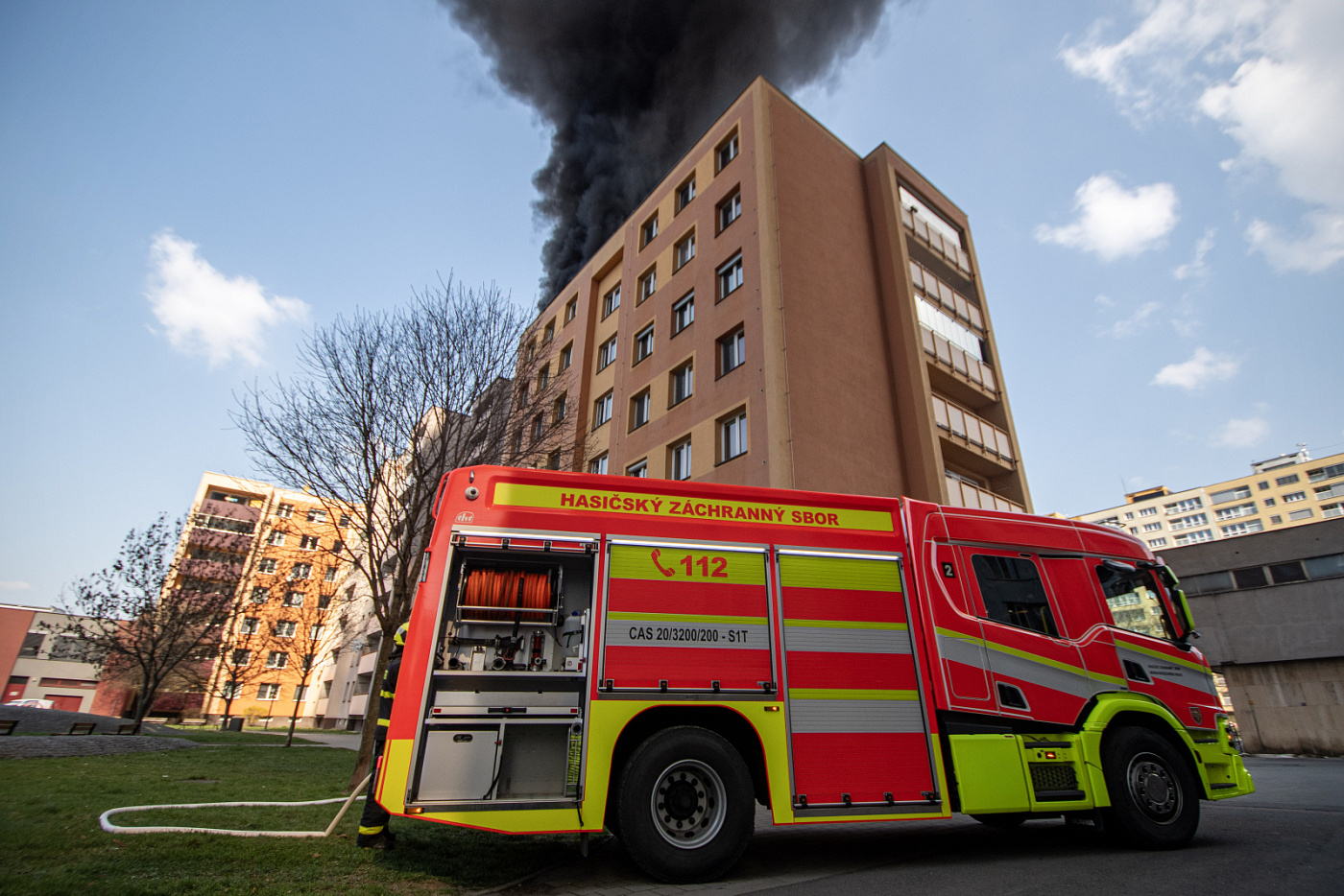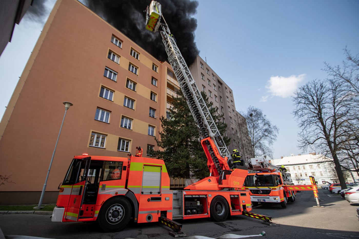 V centru Ostravy hořela střecha paneláku, z místa stoupal hustý černý dým