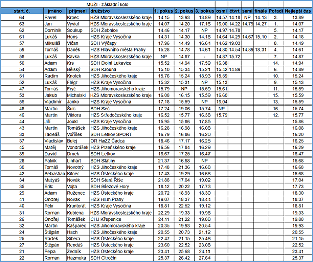 Mezi muži vyhrál Jan Vyvial z HZS Moravskoslezského kraje. Ve finálovém běhu se s ním o zlatou medaili utkal Lukáš Hons z HZS Kraje Vysočina. O zbylé místo na stupních vítězů svedli souboj Pavel Krpec z HZS Moravskoslezského kraje a Tomáš Daněk z HZS hlavního města Prahy, pro cenný bronz si nakonec vylezl zástupce ostravské ekipy. Nejrychlejší mužský čas dne zaznamenal třetím pokusem v základním kole Pavel Krpec z HZS Moravskoslezského kraje (13,89 s), zároveň byl jediným závodníkem letošního ročníku, který svůj výkon hned dvakrát stlačil pod 14 sekund.