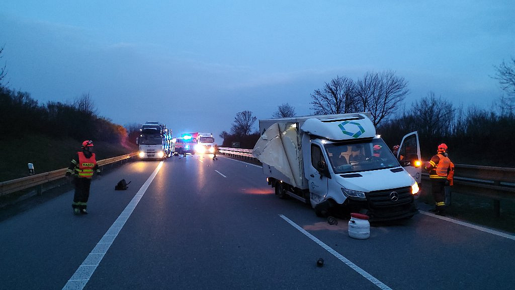 Na 209. kilometru dálnice D1 ve směru na Brno zasahují profesionální hasiči ze stanic Brno – Líšeň, Pozořice a Slavkov u Brna u dopravní nehody nákladního vozidla a dodávky.