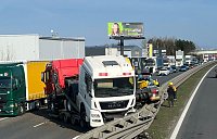 Hasiči zasahují na dálnici D8 ve směru na Prahu. Kamion převážející na tahači nákladní vůz havaroval a prorazil svodidla. Sdílet