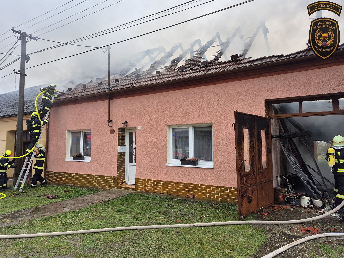 Krátce po půl čtvrté odpoledne vyjíždělo šest jednotek profesionálních i dobrovolných hasičů k požáru garáže rodinného domu v obci Suchá Loz na Uherskohradišťsku. V době příjezdu byla již část střechy v plamenech, všechny osoby se však nacházely mimo ohrožení.