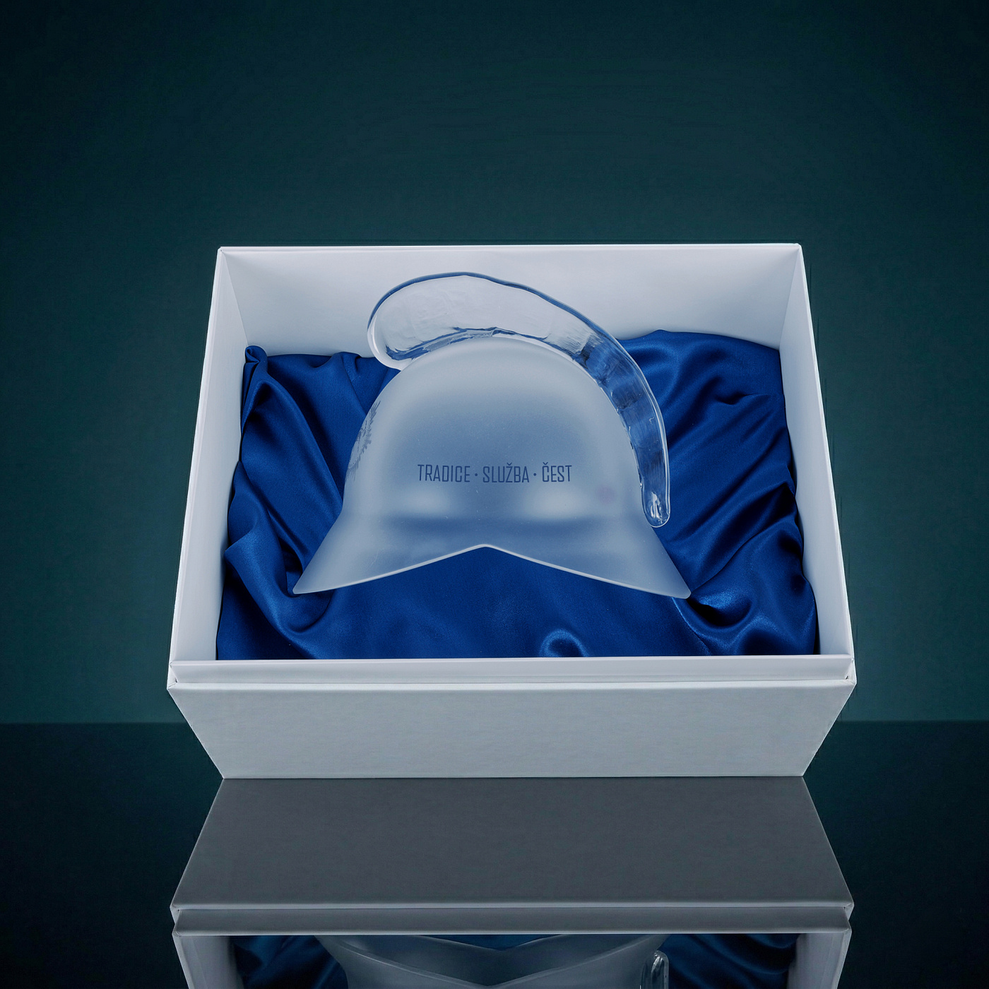 Aby byl dojem z dárku dokonalý je přilba uložena v luxusní bílé krabici s raženým logem a modrým saténem uvnitř. Součástí balení je certifikát pravosti s prostorem pro vaše osobní věnování.
