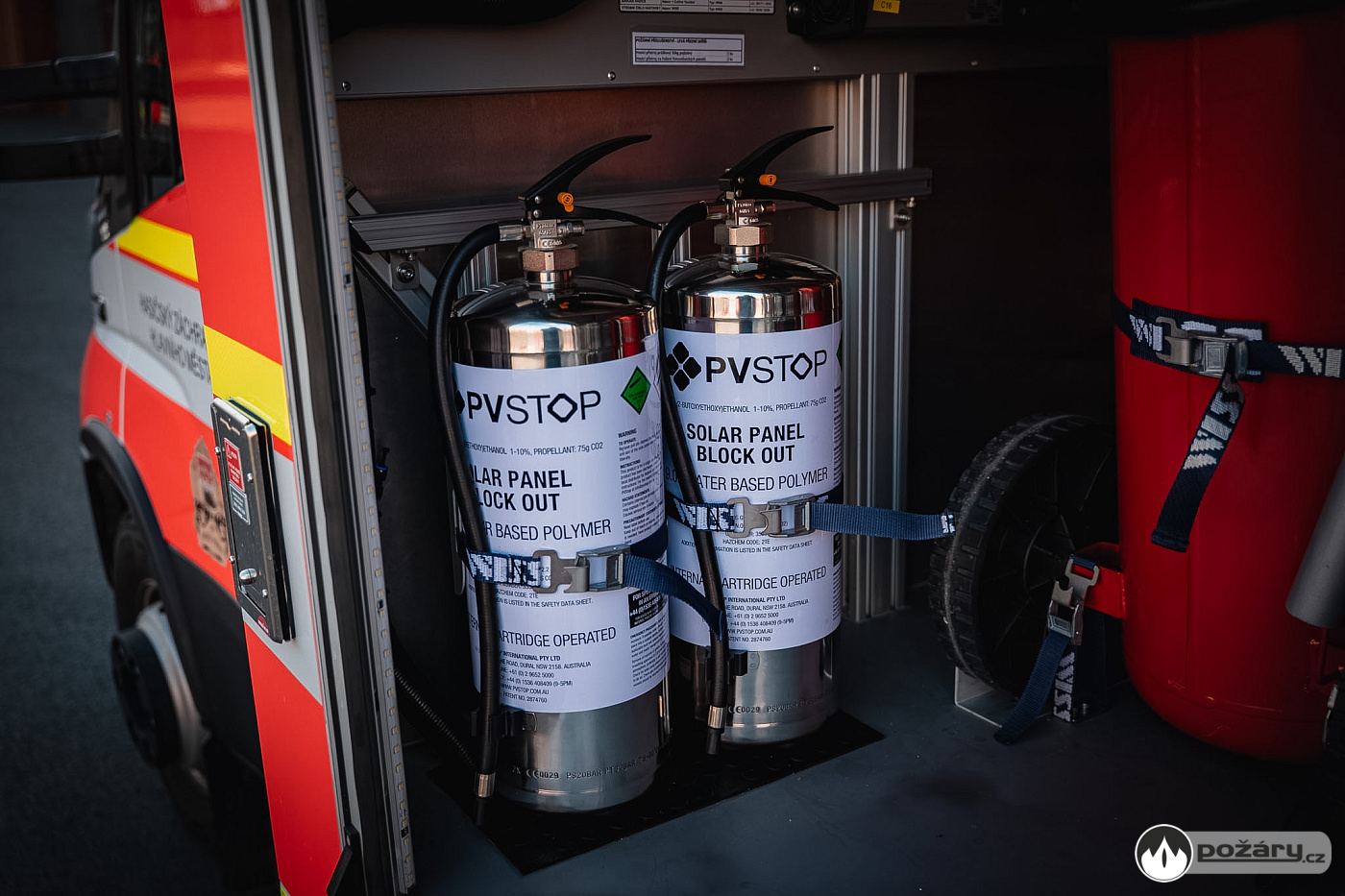 Pro stále častější zásahy na solárních a fotovoltaických panelech mají hasiči připraveny čtyři devítilitrové přístroje PVSTOP.