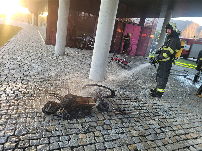 Hasiči po příjezdu na místo události průzkumem zjistili, že došlo k požáru nabíjené elektrokolobežky, vlivem požáru došlo k poškození dalších uskladněných kol a koloběžek. Hasiči nasadili jeden útočný proud a koloběžky s koly vynesli na volné prostranství, kde byly dále ochlazovány a kontrolovány termo kamerou.