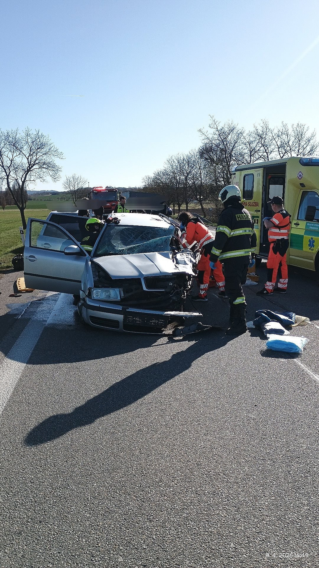 Profesionální hasiči ze stanic Písek a Vodňany zasahují na silnici nedaleko Protivína u čelního střetu osobního a dodávkového automobilu. Pomocí hydraulického vyprošťovacího zařízení provedli hasiči vyproštění zraněné osoby ze zdemolované Octavie.