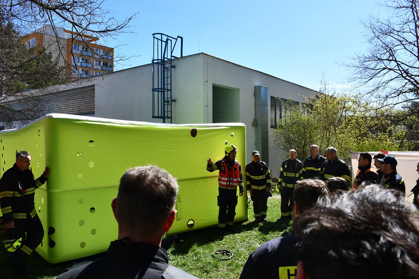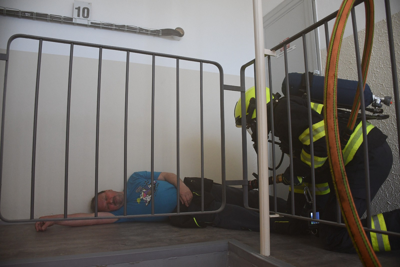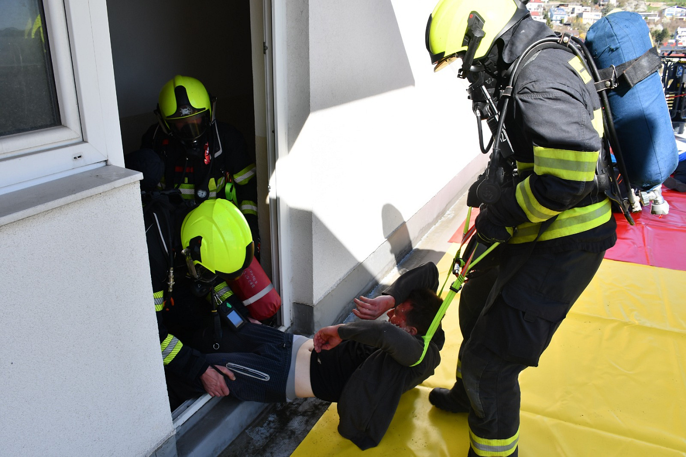 Námět byl rozšířen o smrtelné zranění osoby, která v panice vyskočila z okna. Zásahem bylo nutné uhasit požár, provést průzkum a následnou záchranu zraněných osob ohrožených na životě, jak vnitřní zásahovou cestou po schodišti, tak i ze střechy budovy pomocí automobilového žebříku. Pro záchranu byla připravena i seskoková matrace.