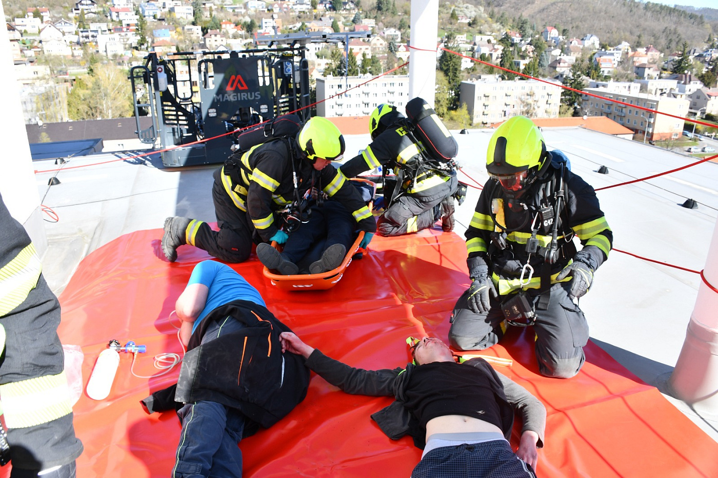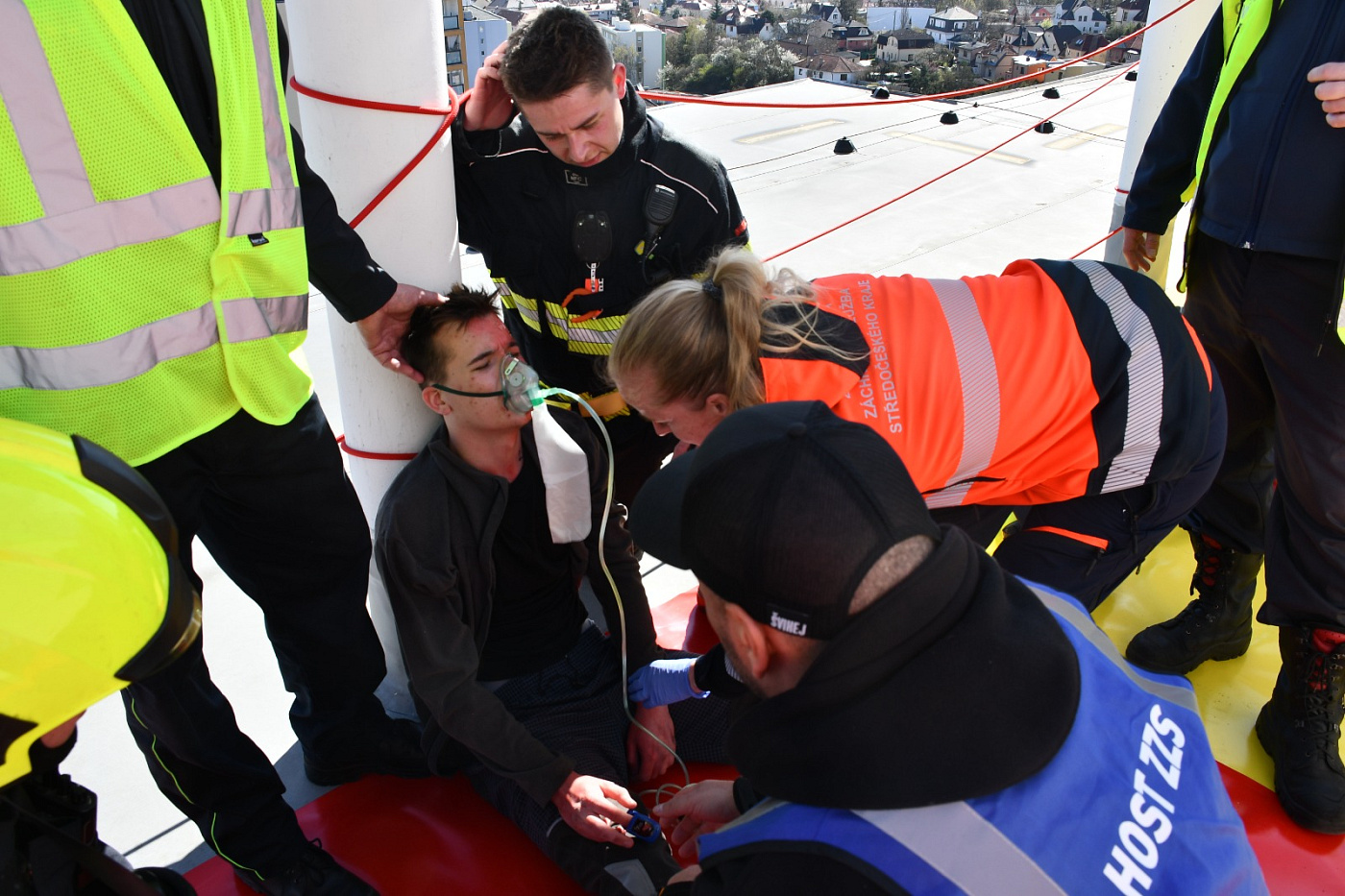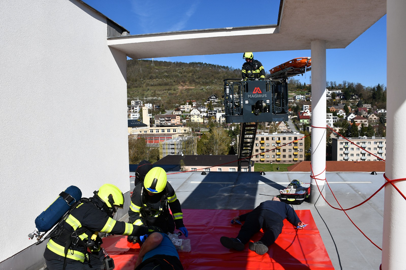 Námět byl rozšířen o smrtelné zranění osoby, která v panice vyskočila z okna. Zásahem bylo nutné uhasit požár, provést průzkum a následnou záchranu zraněných osob ohrožených na životě, jak vnitřní zásahovou cestou po schodišti, tak i ze střechy budovy pomocí automobilového žebříku. Pro záchranu byla připravena i seskoková matrace.