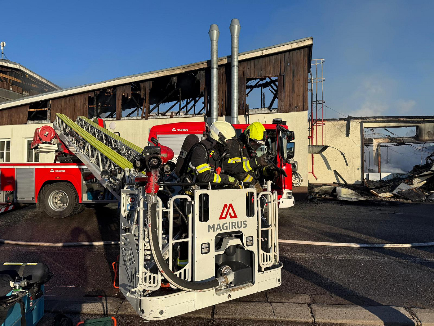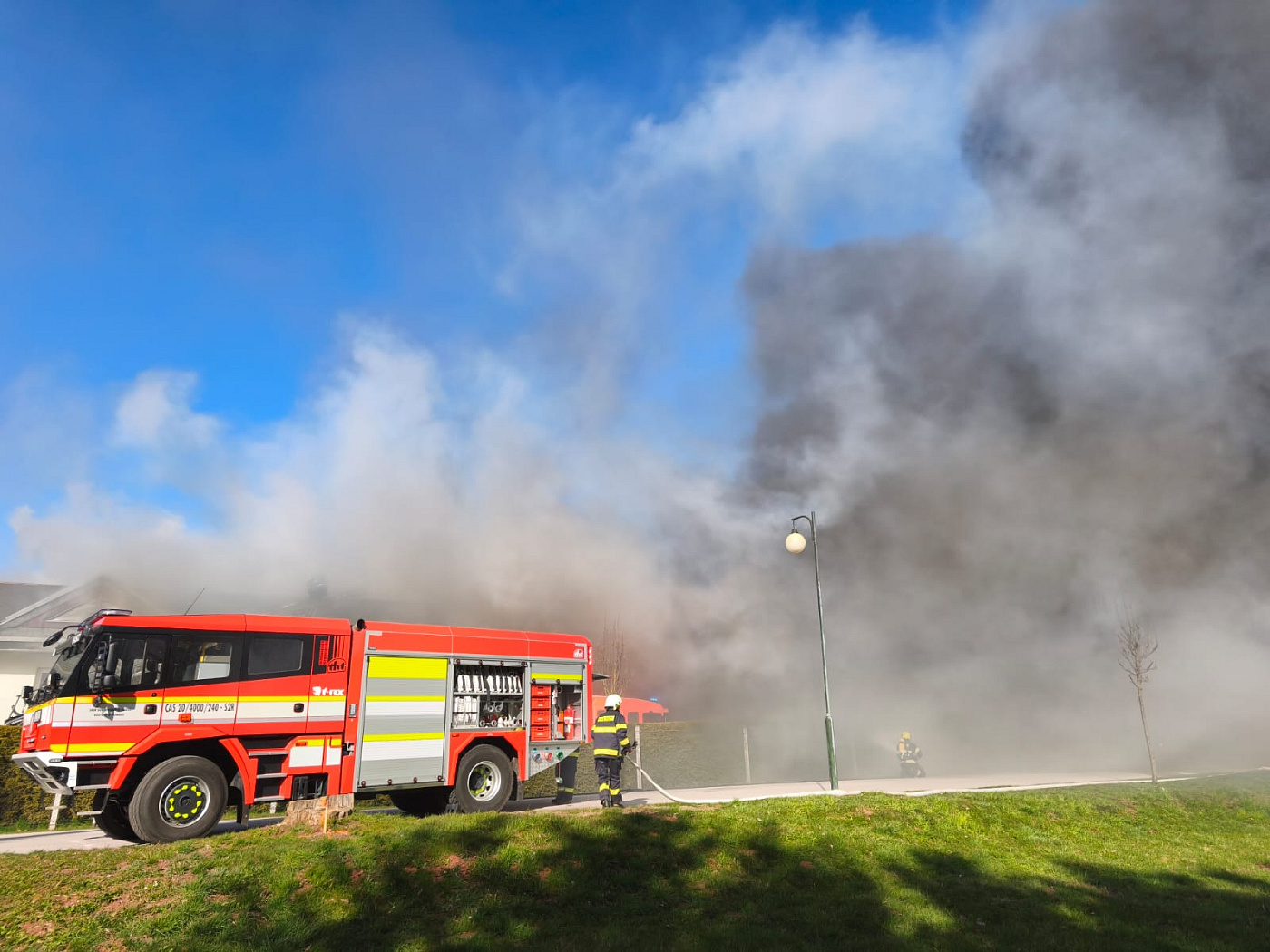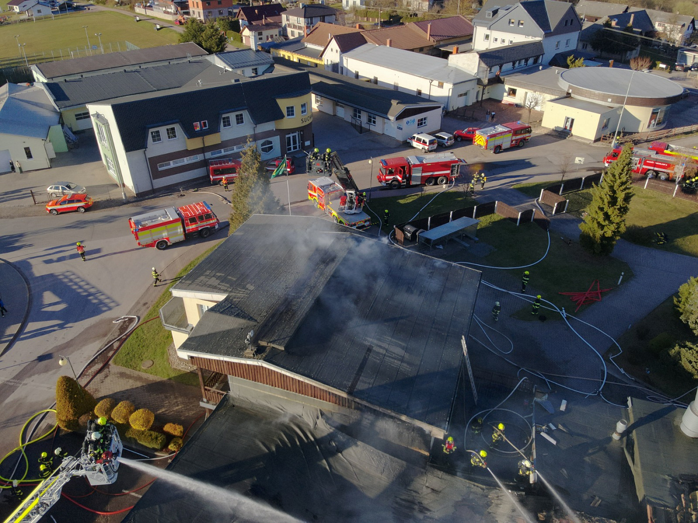 První hasičská jednotka byla na místě události a prováděla průzkum již dvě minuty před 16. hodinou, ještě předtím stihly budovu bezpečně opustit dvě desítky osob a nikdo nebyl zraněn. Požárem byla v tu chvíli zasažena část střechy haly.