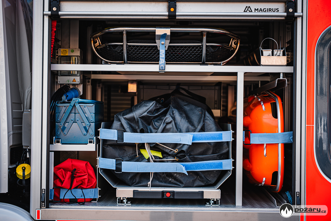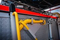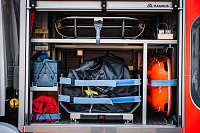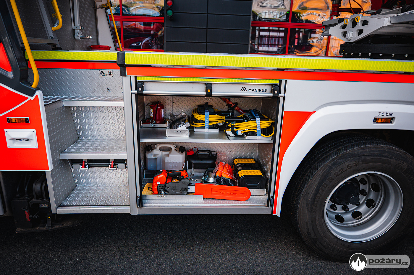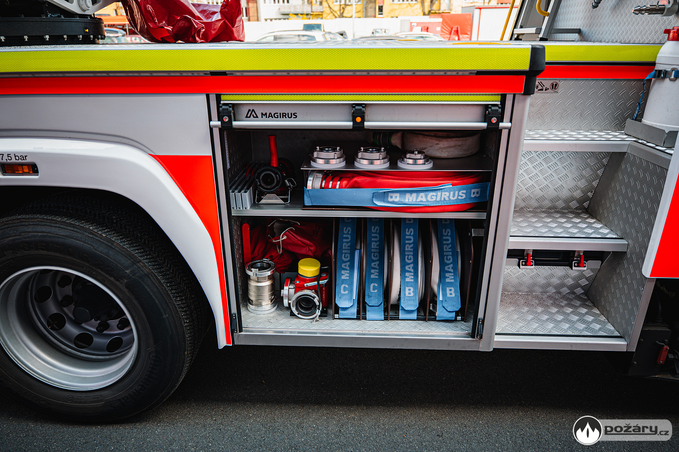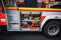 Úložné prostory a pochozí plocha jsou řešeny modulárním systémem Alu-Fire z hliníku. Na obou stranách vozidla najdeme dvojici skříní na vybavení, které uzavírají hliníkové roletky s průběžnými madly.